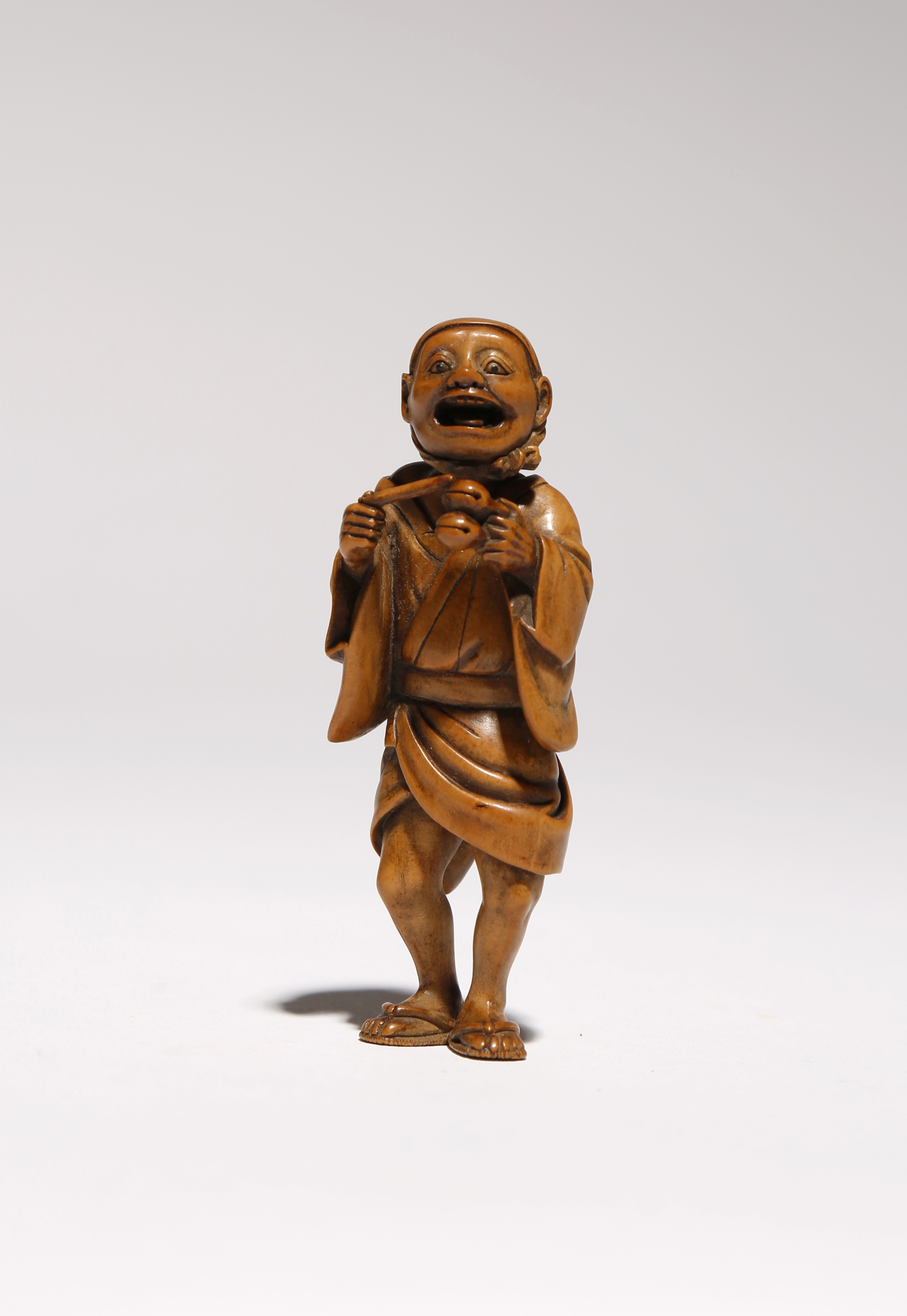 A JAPANESE WOOD NETSUKE OF A STREET ENTERTAINER