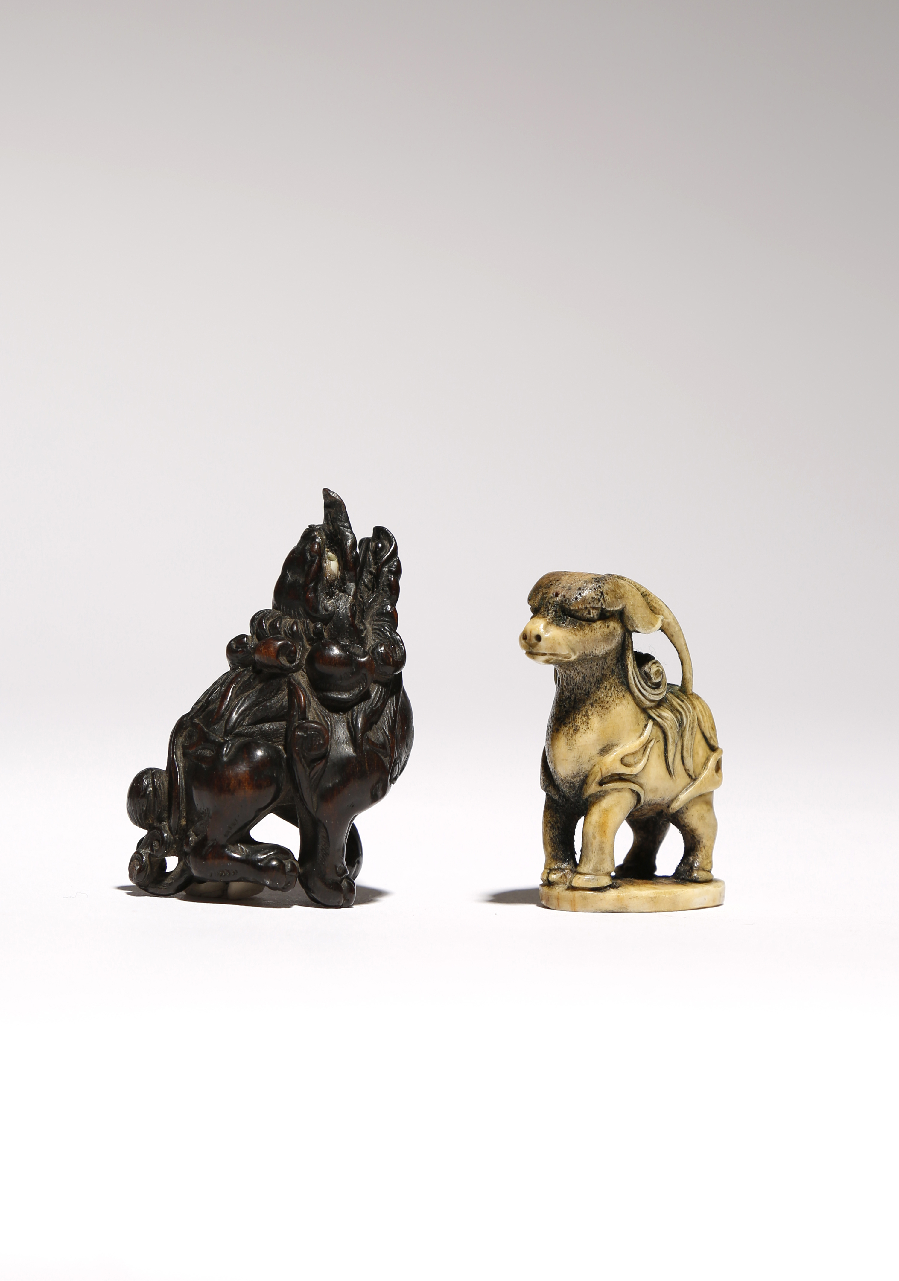 The first in wood and depicting a shishi, the lion dog seated on its haunches and with its head raised, a minute three character signature under its paw; the other in stag antler and depicting a kirin on an oval base, with fire wisps between its legs and long horns curving towards its back, unsigned, 6cm and 5.5cm respectively. (2)