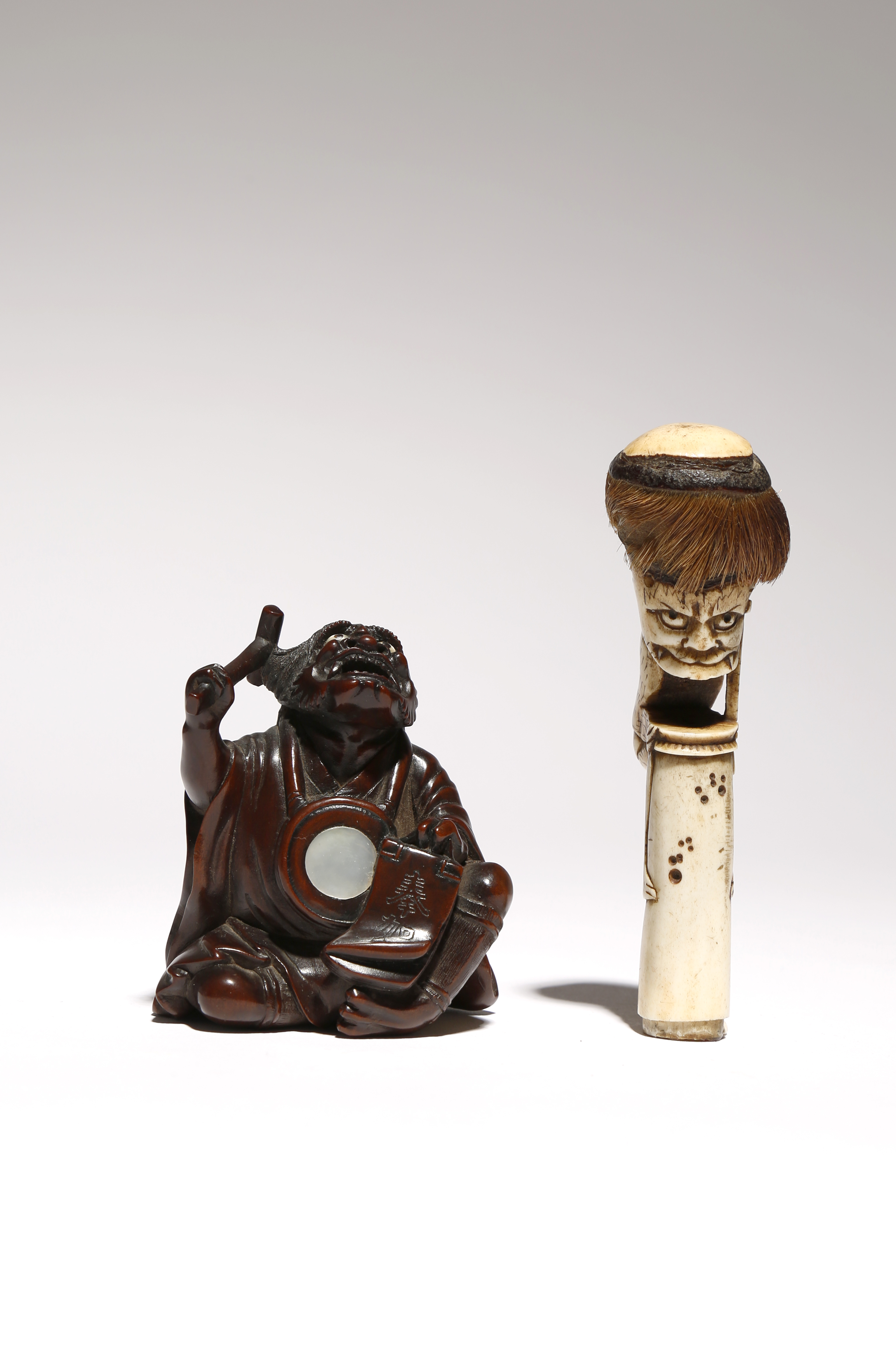 The repentant demon wearing monk's robes and a drum suspended around his neck, holding a donation ledger in one hand inscribed Hoga cho (subscription list) and rising a drum beater in his other hand, the gong and his eyes inlaid in mother of pearl; together with a stag antler handle carved as an oni climbing over a pole, the demon with a bowl cut made of the original antler hair, both unsigned, 8cm and 11.5cm respectively. (2)