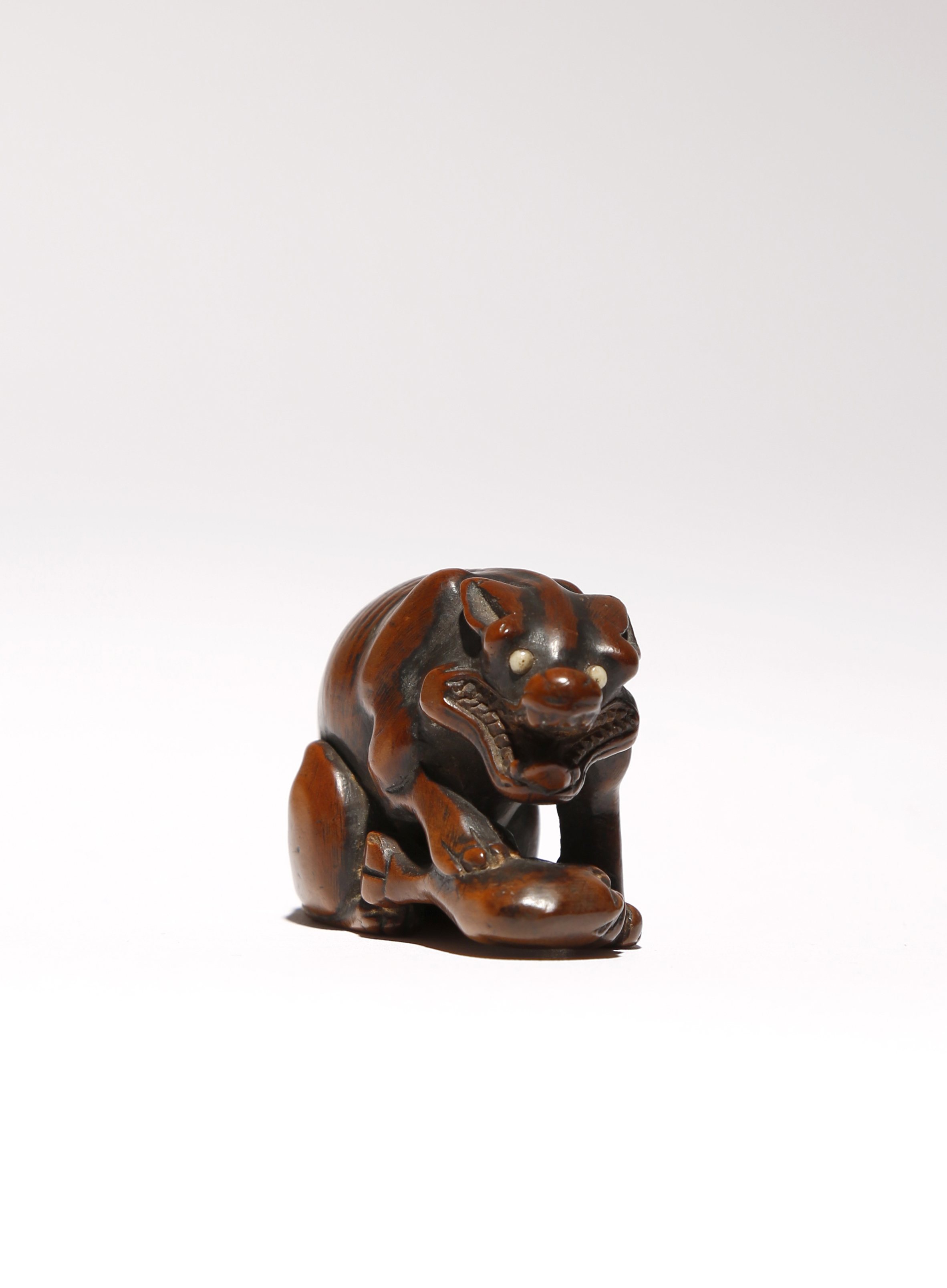 The emaciated beast seated on its haunches with its mouth wide open, its front paw resting on a leg of venison before it, the eyes inlaid, its tail tucked underneath forming the himotoshi and signed Tomotada in an oblong reserve, 5.5cm.
