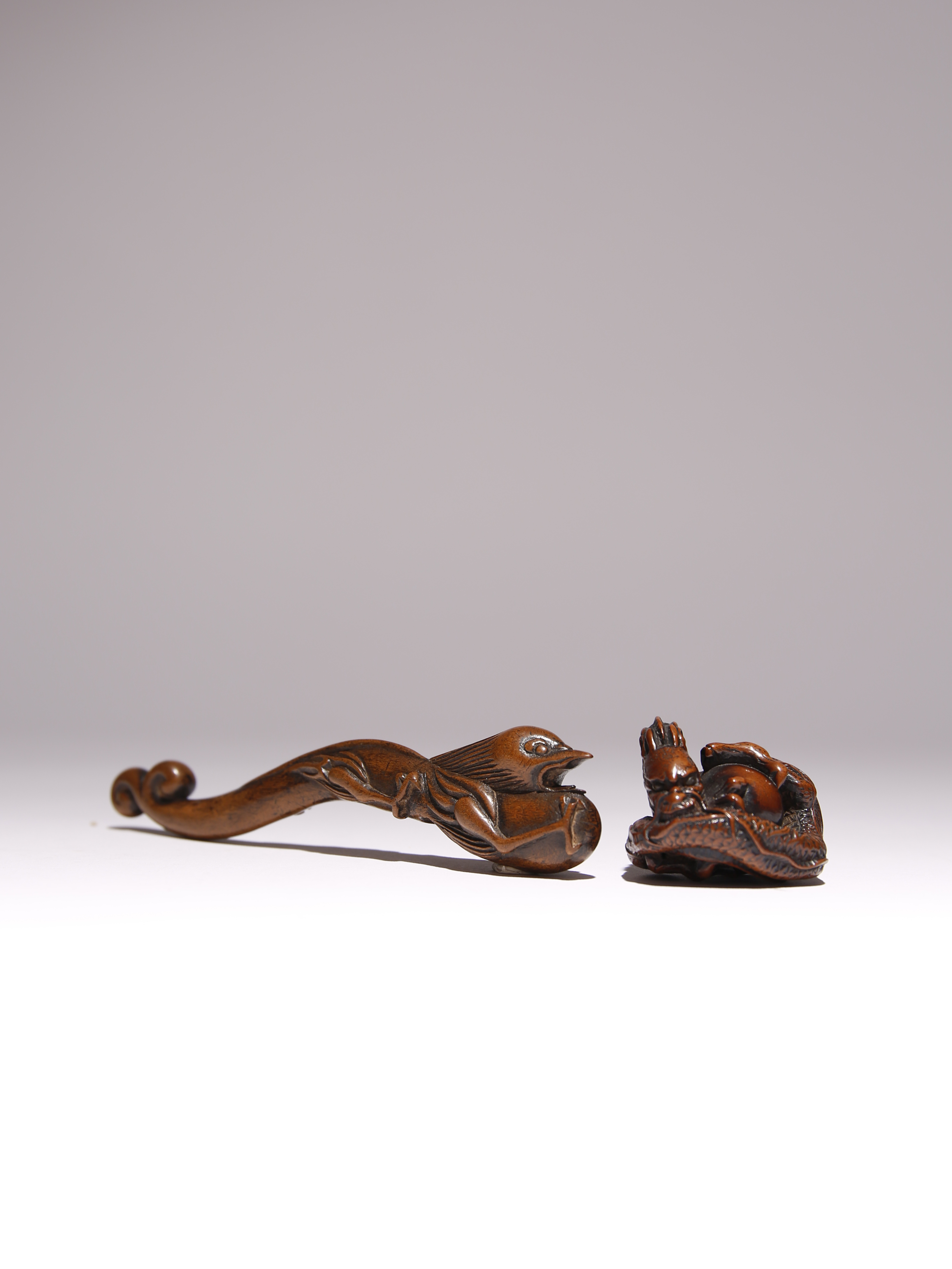 One a sashi netsuke carved as a hyriu (bird-like dragon), its beak wide open and with fire wisps engulfing its legs, its tail bifurcated, unsigned; the other depicting a three-clawed dragon coiling around a sacred pearl of wisdom, its eyes inlaid in horn, discreetly signed on the inside of its tail, possibly Miwa, 12.8cm and 4cm respectively. (2)
