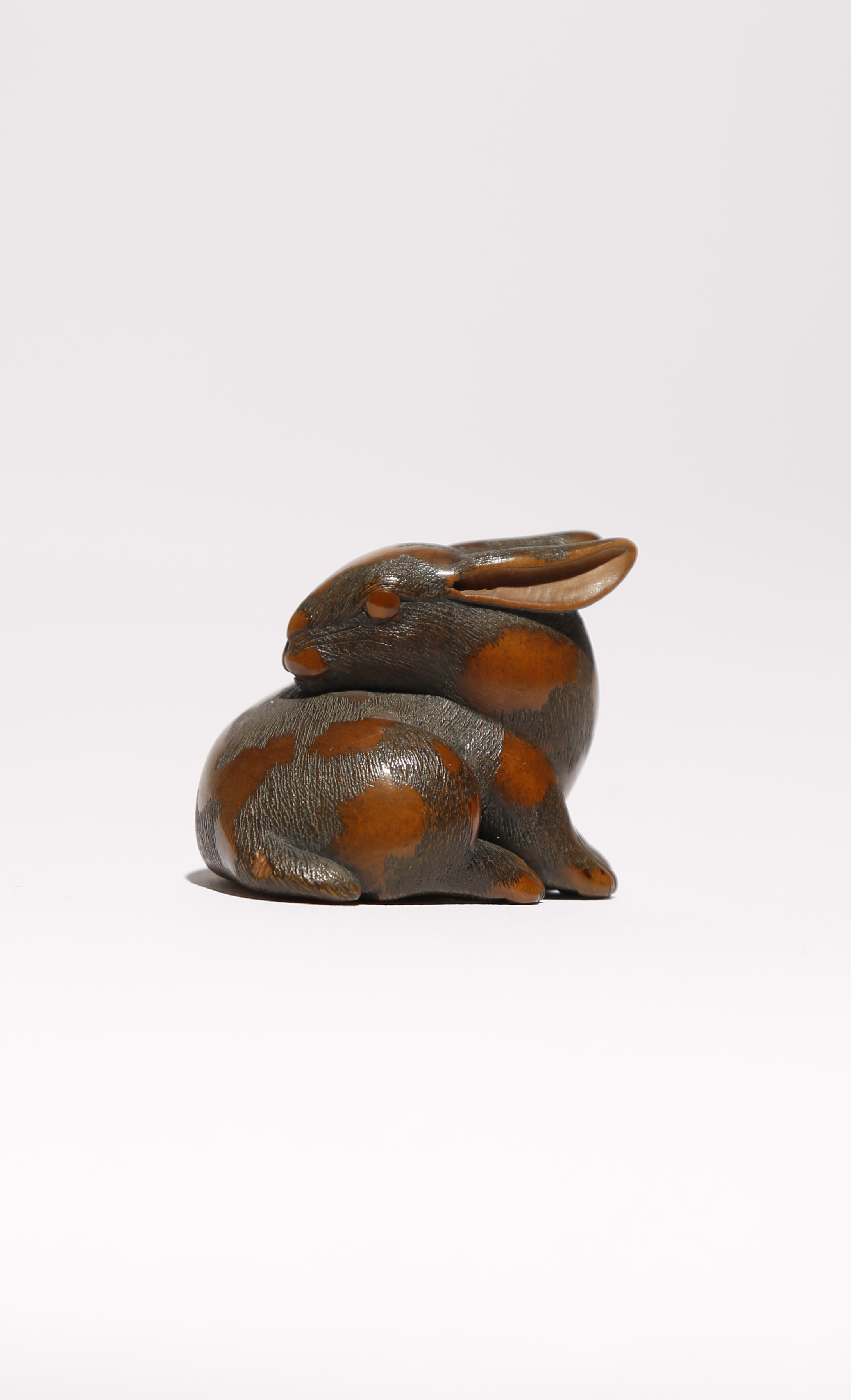 A JAPANESE WOOD NETSUKE OF A HARE WITH AMBER EYES