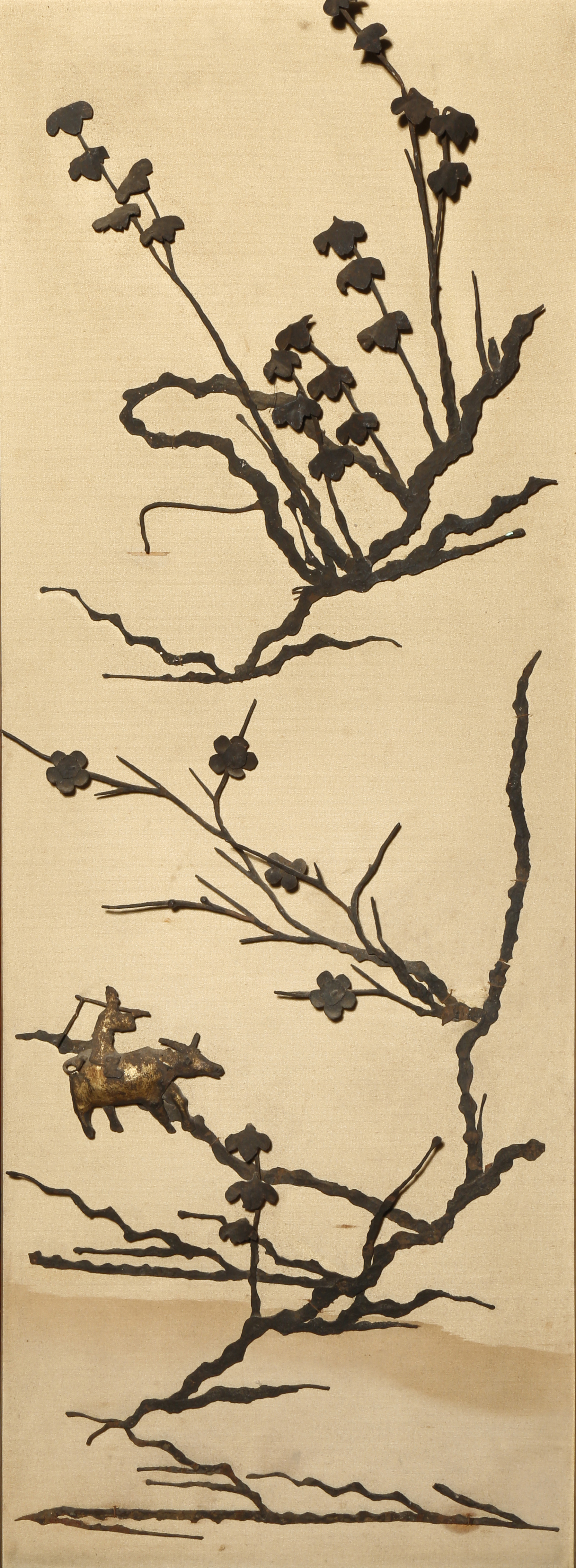 Depicting a man riding a buffalo beneath leafy branches and blossoming prunus, the design mounted on silk and contained within a wood frame, 108.5cm x 42.5cm.