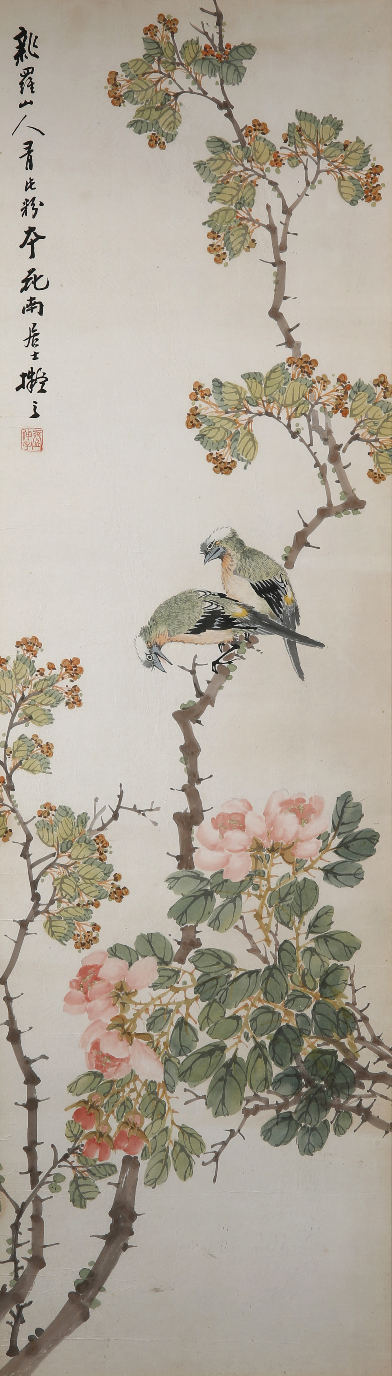 Four Chinese paintings, ink and colour on paper, inscribed, each signed and with one artist's seal, framed and glazed, 105cm x 31cm. (4)