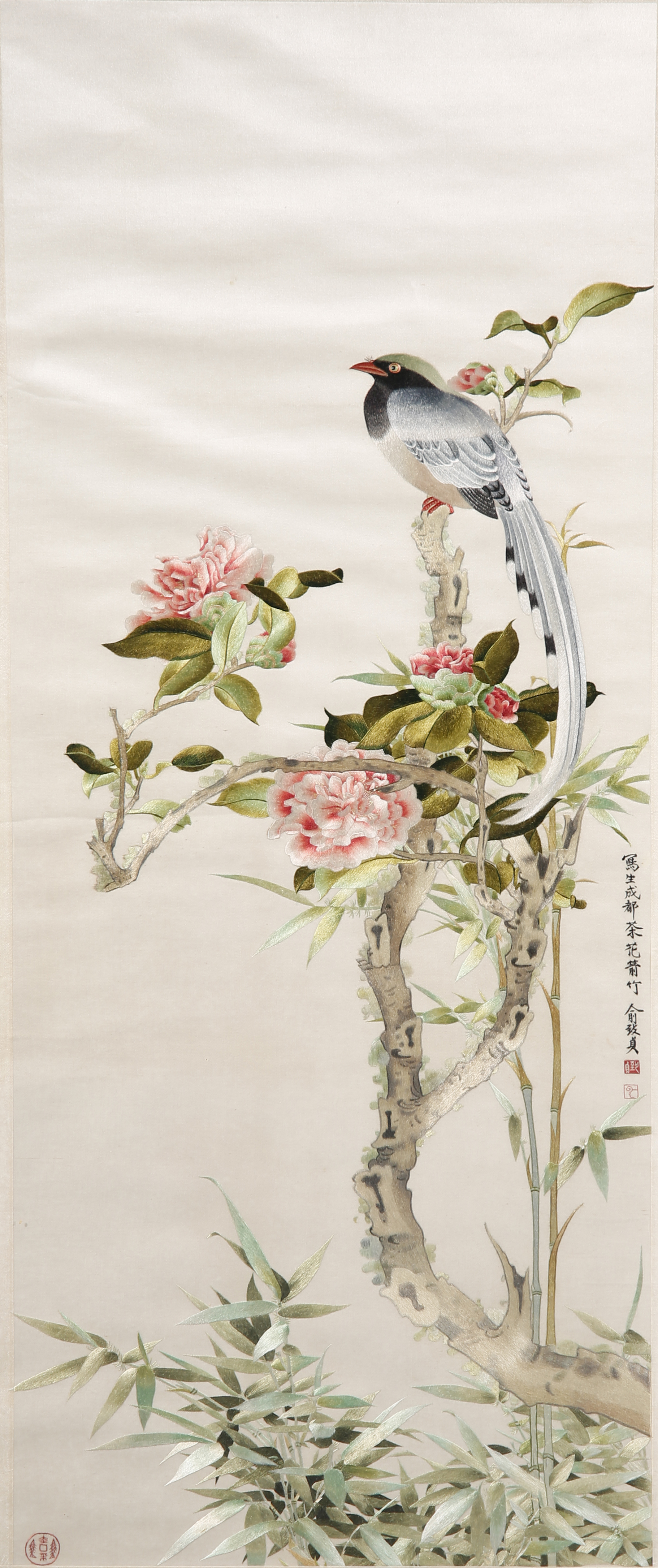 FOUR CHINESE EMBROIDERED SILK 'BIRDS AND FLOWERS' PANELS