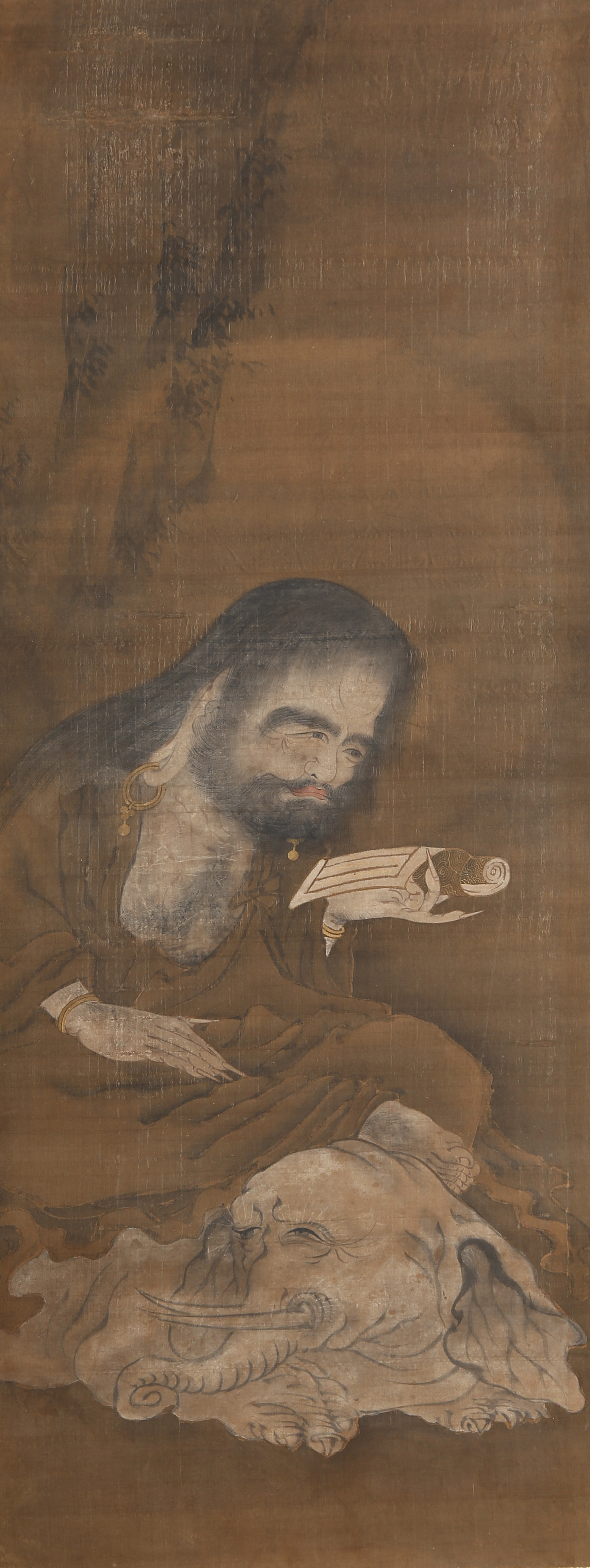 A scroll painting, ink and colour on silk, heightened with gilt, together with a wood box, 112cm x 42cm.