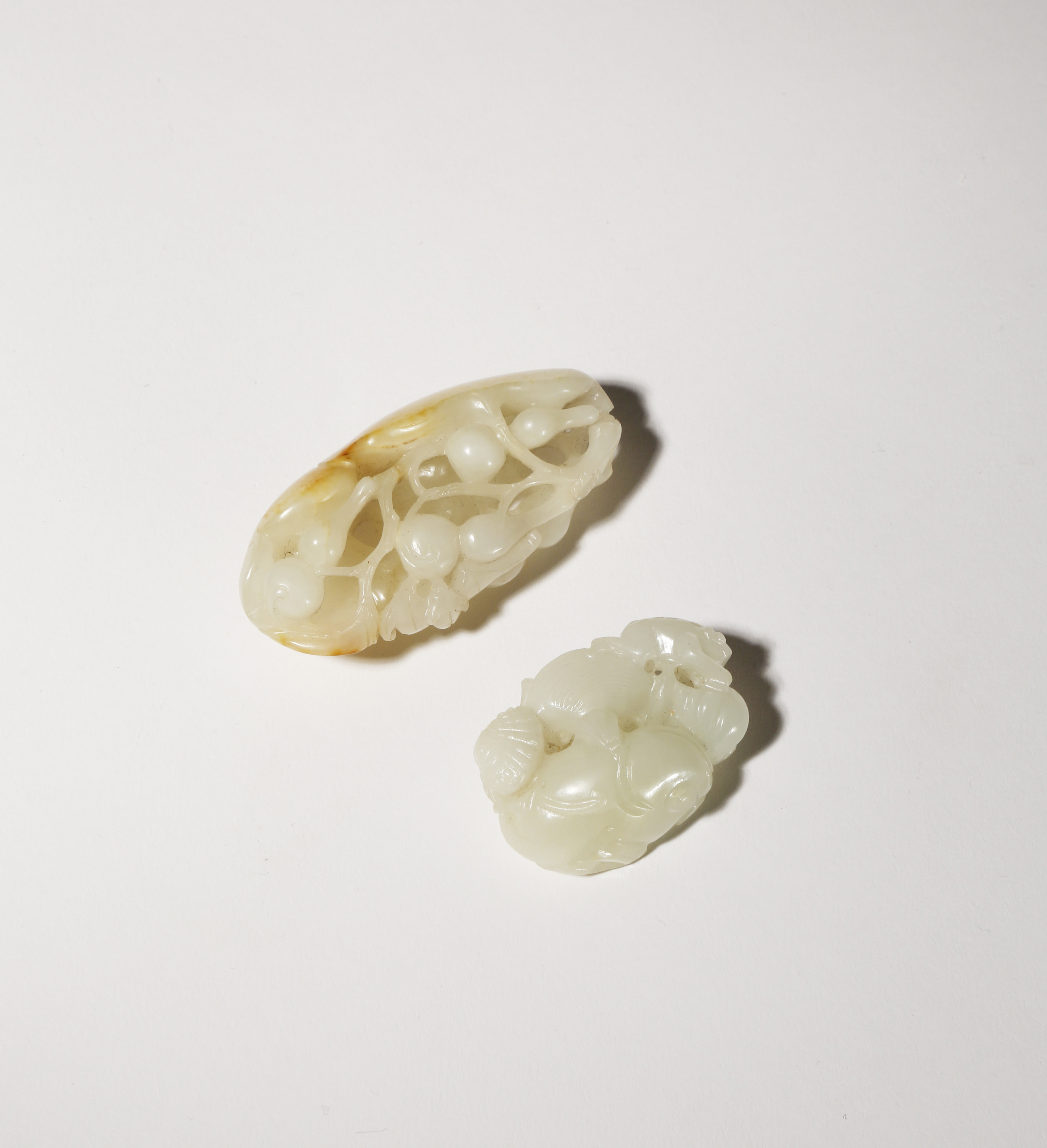 One deeply carved with gourds growing from twisting vines, with a bat clinging on to one of the fruits, the pale stone with some russet markings, the other formed as a fish and a frog amongst variously shaped shells, the stone with some minor inclusions, 6.1cm and 4cm. (2)
