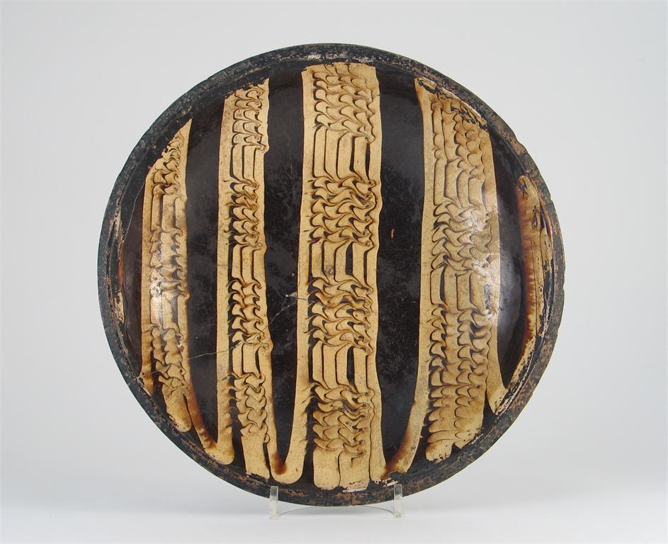 A slipware shallow bowl, decorated with dark brown bands, and combed slip trailed bars. A riveted crack. 18th century, 28cm.