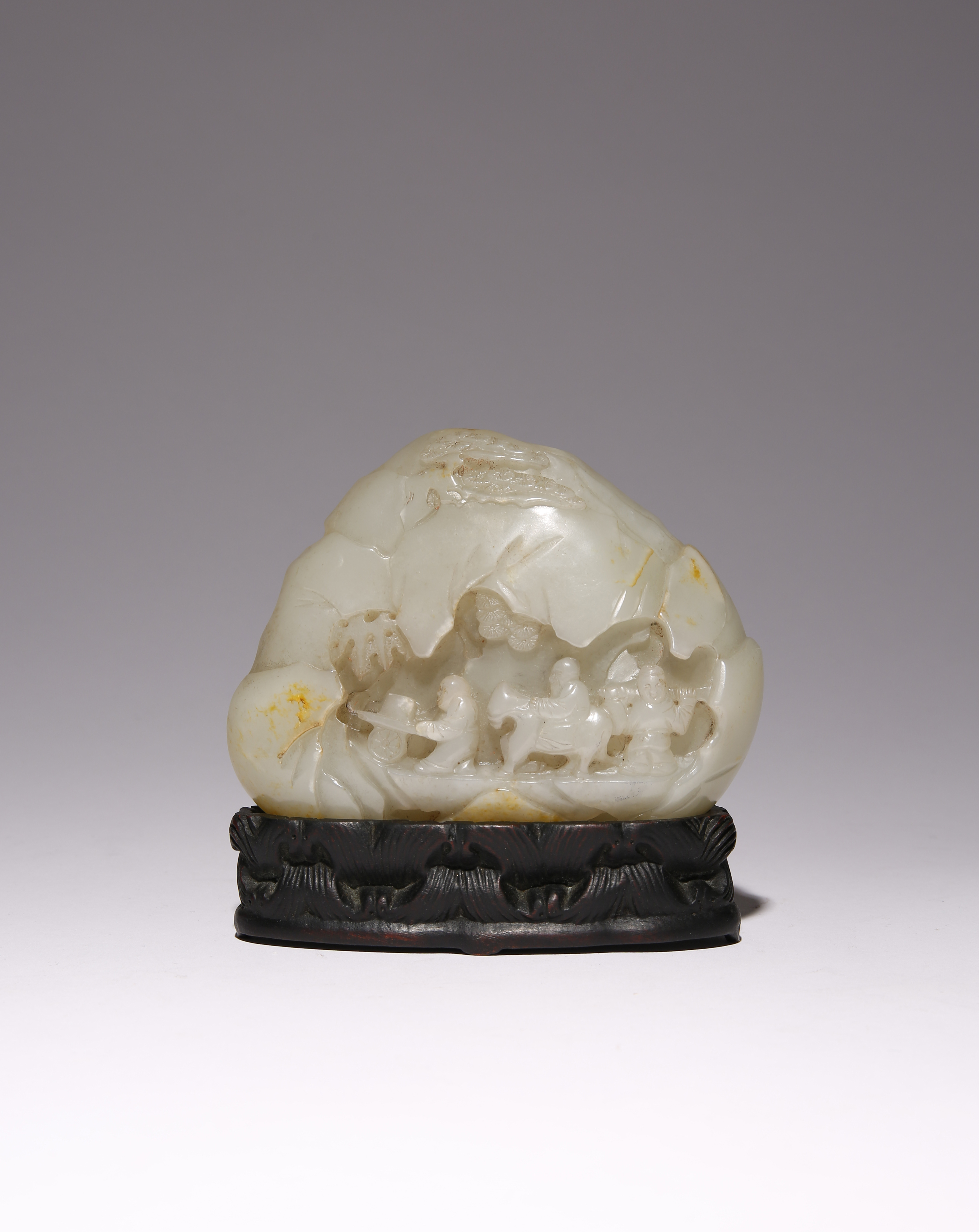 Carved with figures on a rocky mountain path, one rides a mule as the others transport goods, worked with a mountain range to the reverse, the greyish stone with russet markings, together with a wood stand, 11.5cm. (2)