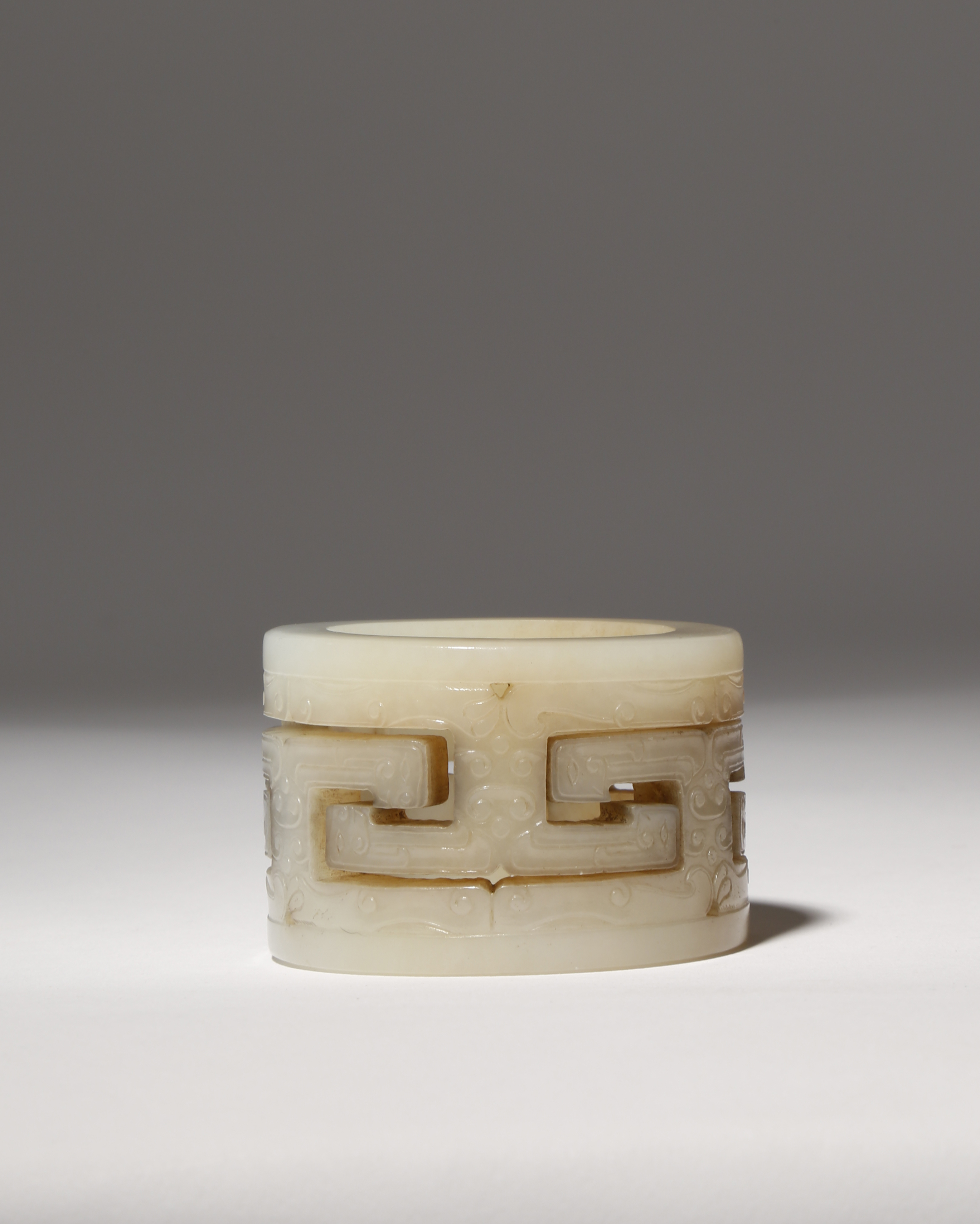 Carved in openwork with an interlocking design of 'T' scrolls, the exterior decorated in low relief with archaistic scrolls, the stone with light brown inclusions, 5.5cm.