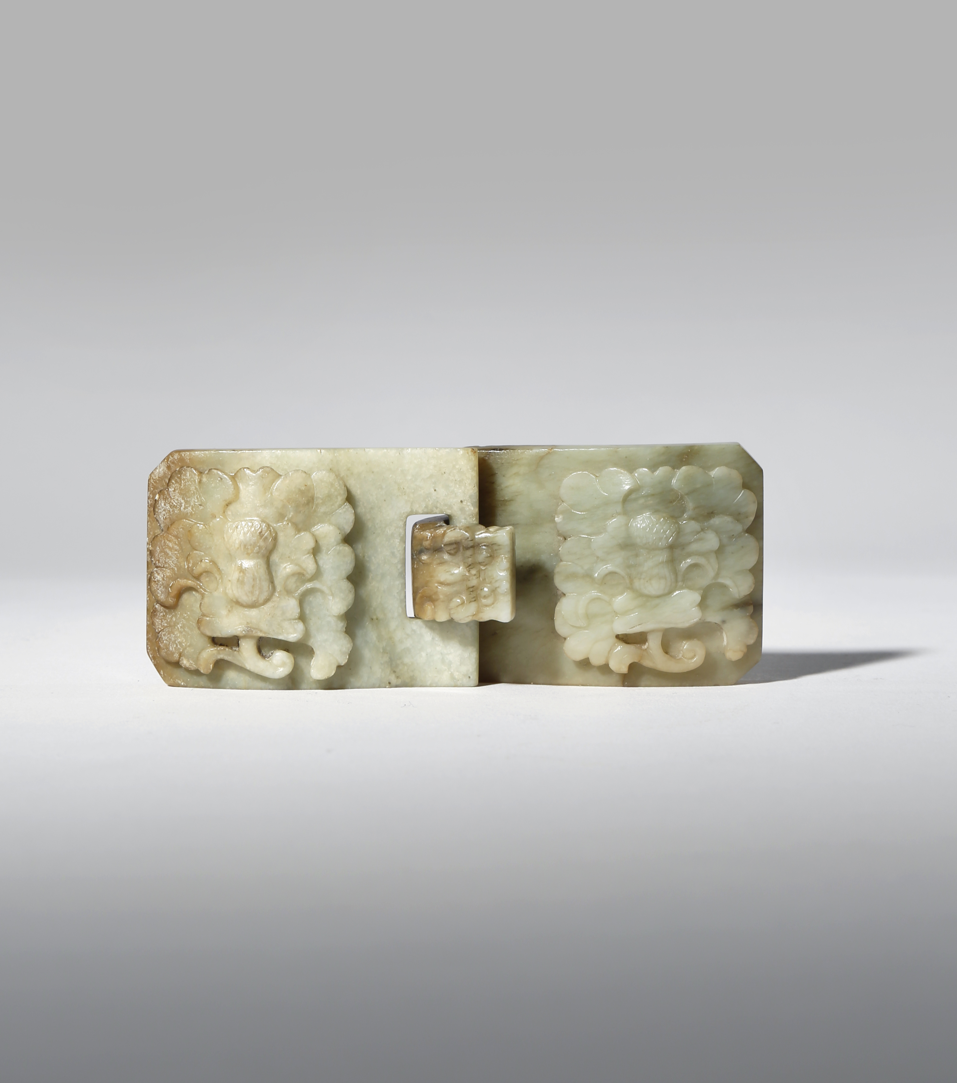Each of the two sections carved in relief with a flowerhead, the hook worked as the head of a mythical beast, with a rectangular knob to the reverse of each section, the stone with russet inclusions, 10cm overall. (2)