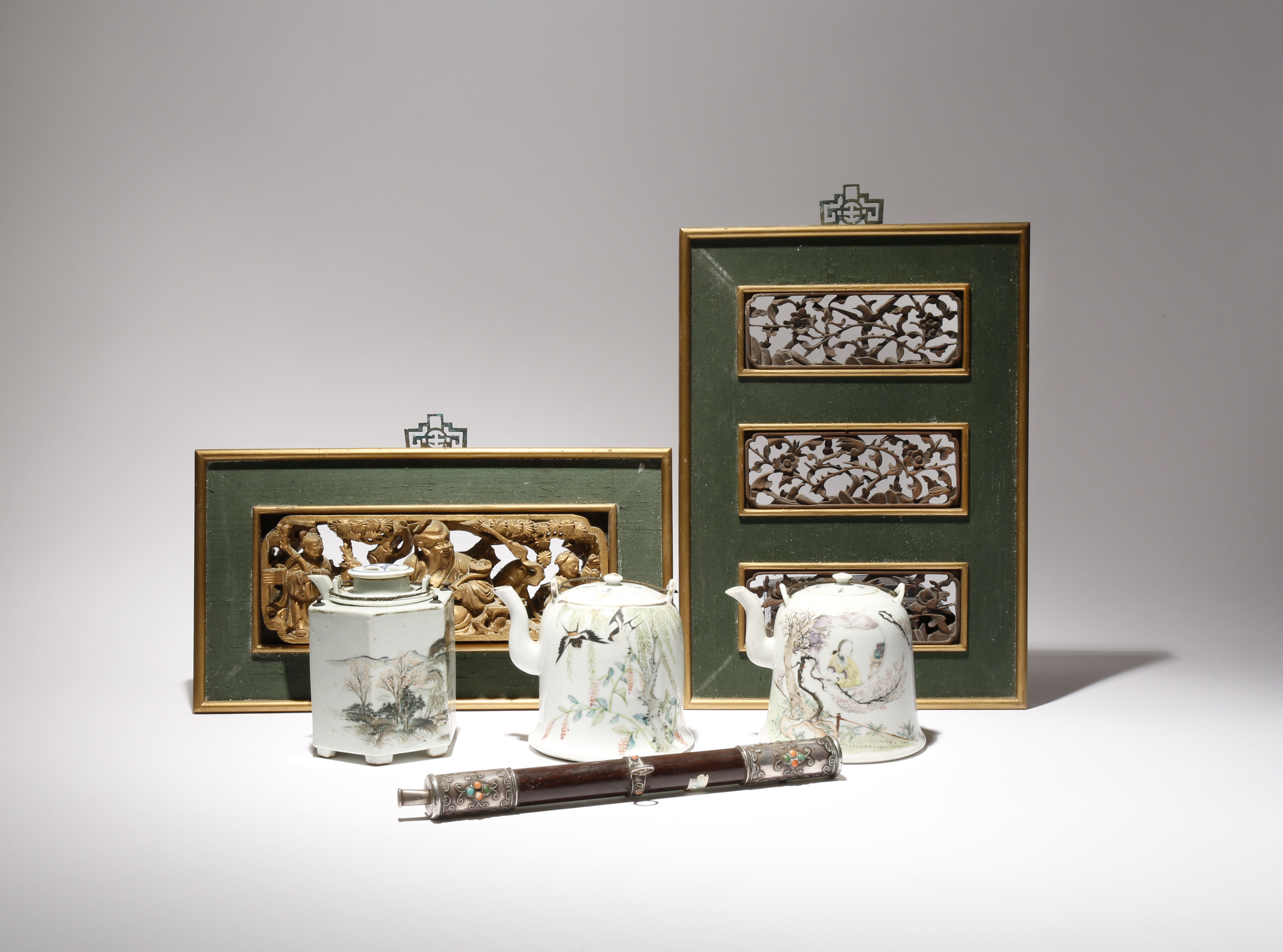 Comprising: a wood opium pipe with metal mounts inset with coloured jewels, two frames containing openwork carved wood panels, one depicting an Immortal with his attendants, the other with three panels of birds and flowers, and three enamelled teapots and covers, the bell-shaped teapots with four character marks to the bases reading guan yao nei zao, the hexagonal-section teapot with a removable liner and a matched cover, with an impressed seal mark to the base, 37cm max. (10)