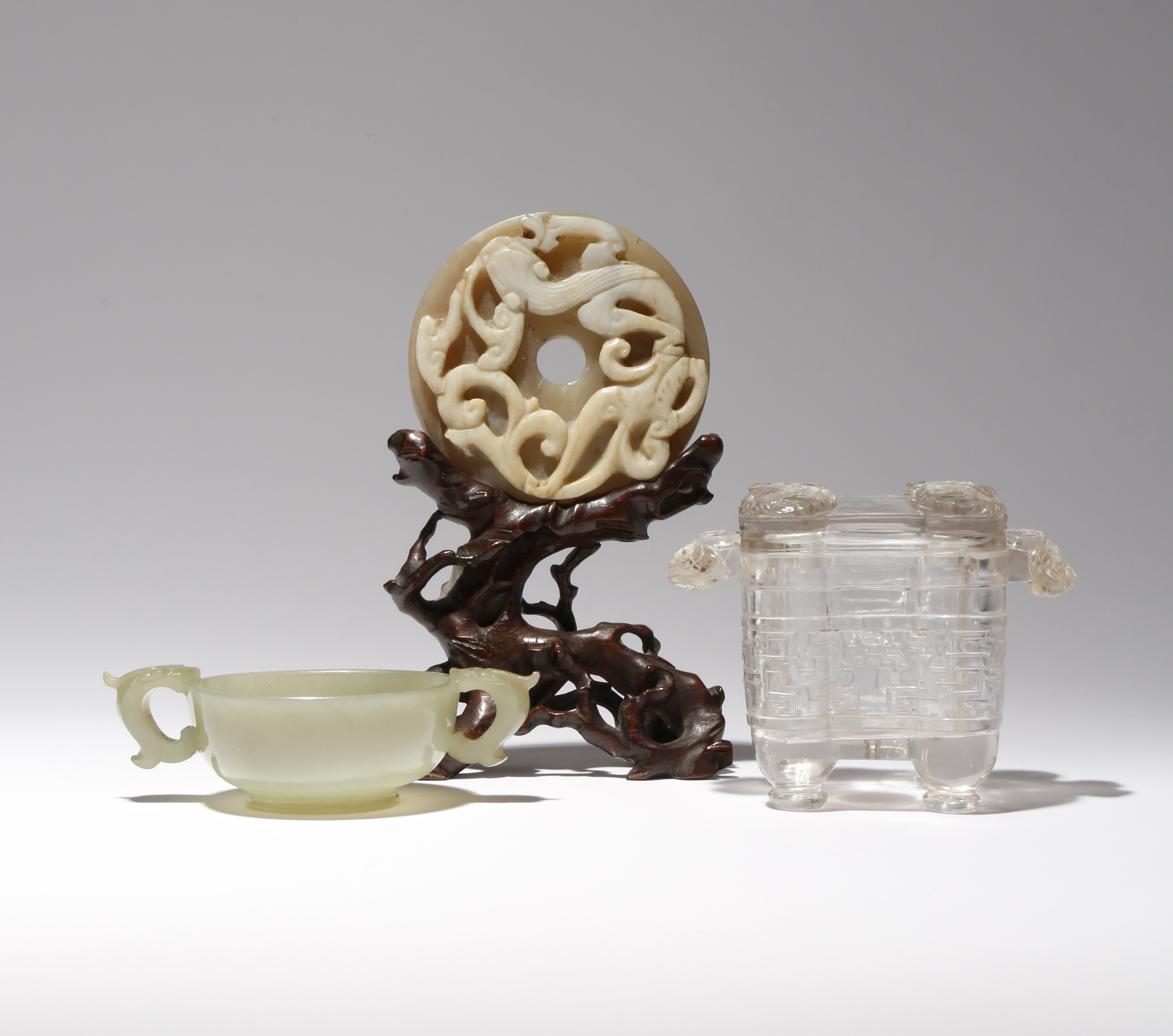One jade item a bi worked in relief with a chilong holding lingzhi, the mythical beast picked out in a calcified section of the stone, together with a wood stand, the other jade item carved as a twin-handled cup, with chilong masks to the handles, the rock crystal incense burner decorated with a band of archaistic motifs, with four stylised phoenix medallions to the cover, carved in relief to two sides with handles formed as lingzhi, 11.3cm max. (5)