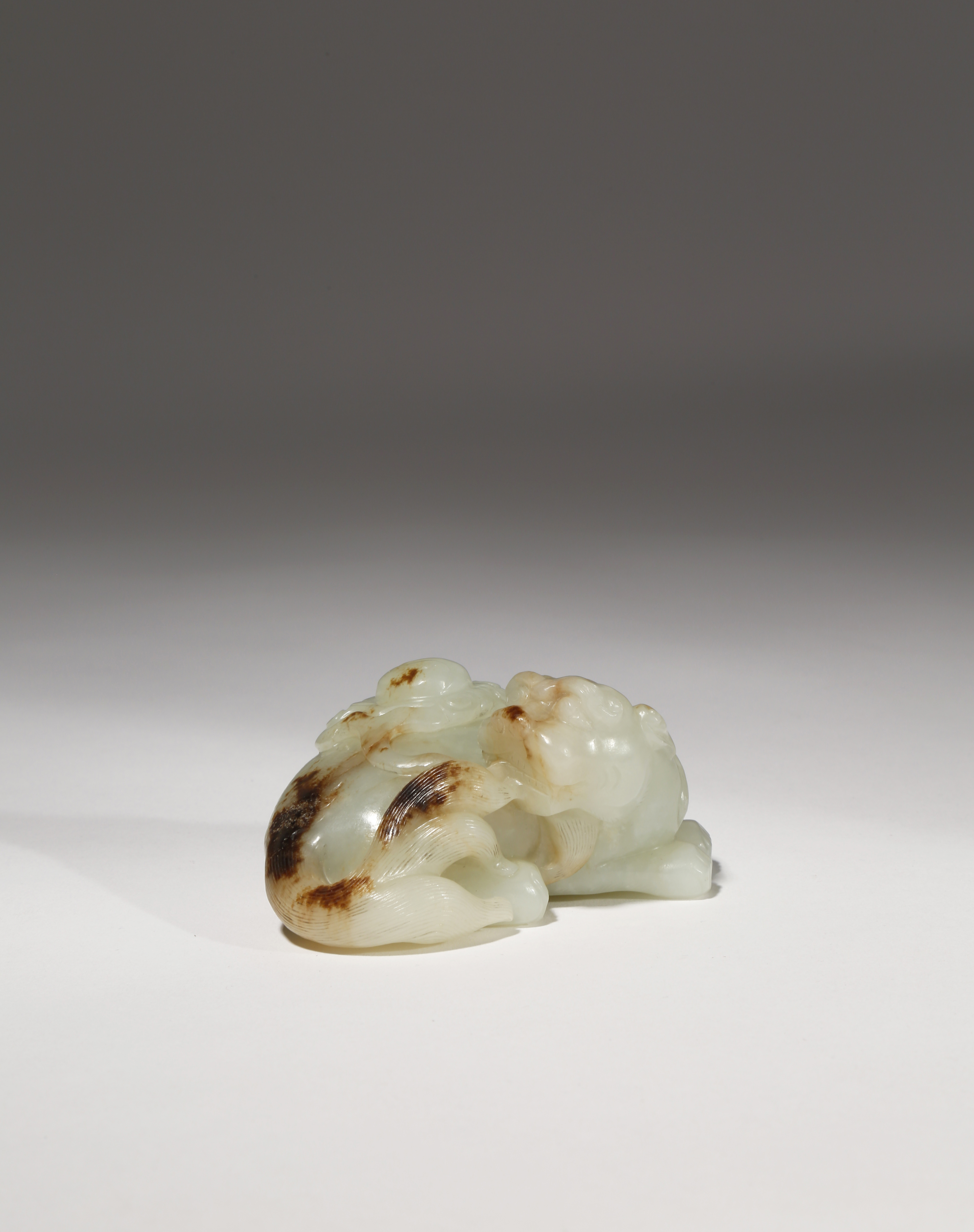 A CHINESE PALE CELADON JADE CARVING OF A LION DOG