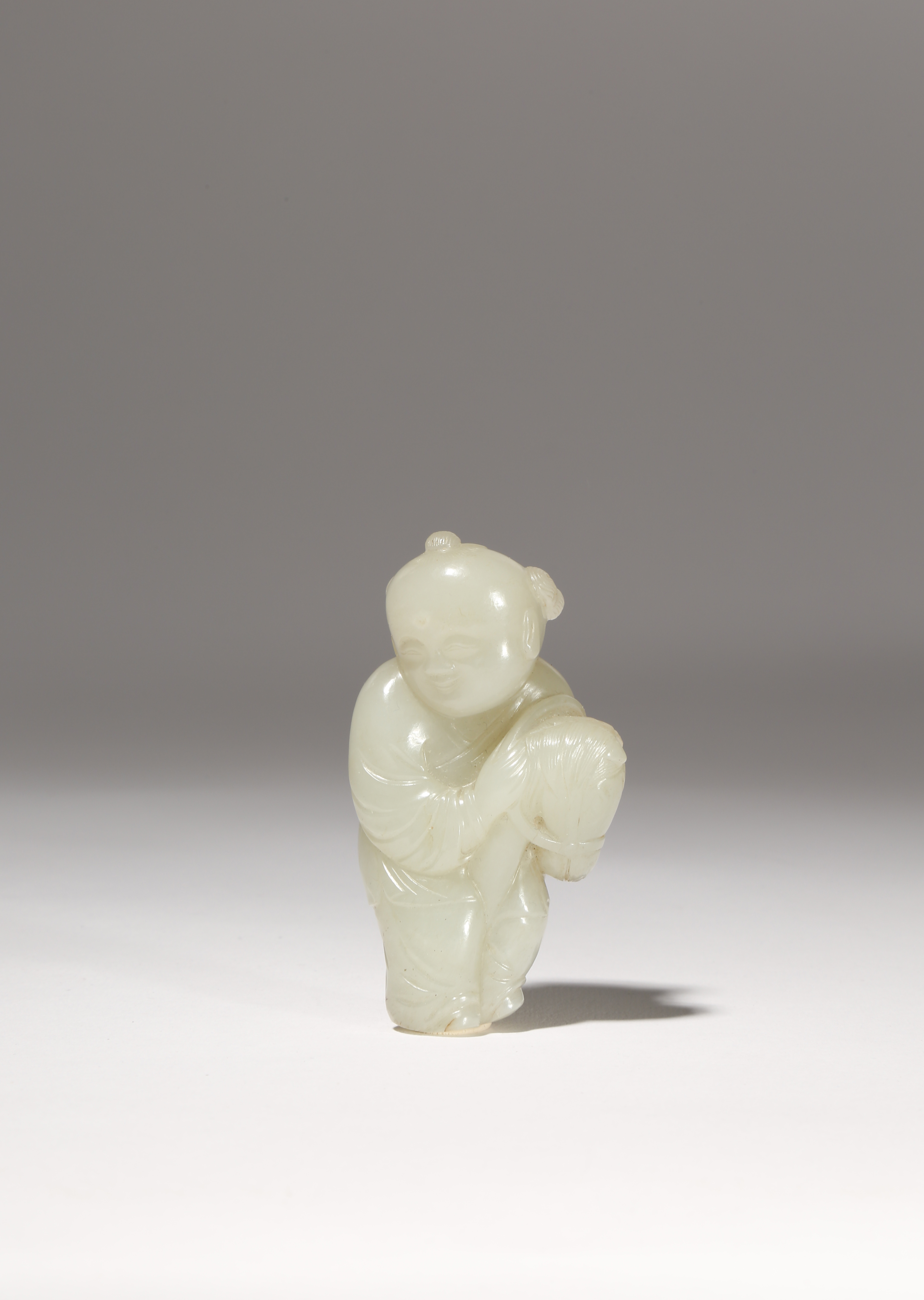 Carved as a young boy riding a hobby horse, bearing a cheerful expression on his face, with his hair tied in three buns, with two holes for suspension to the reverse, the stone of an even tone with some minor inclusions, together with a silk pouch, 7.3cm. (2)