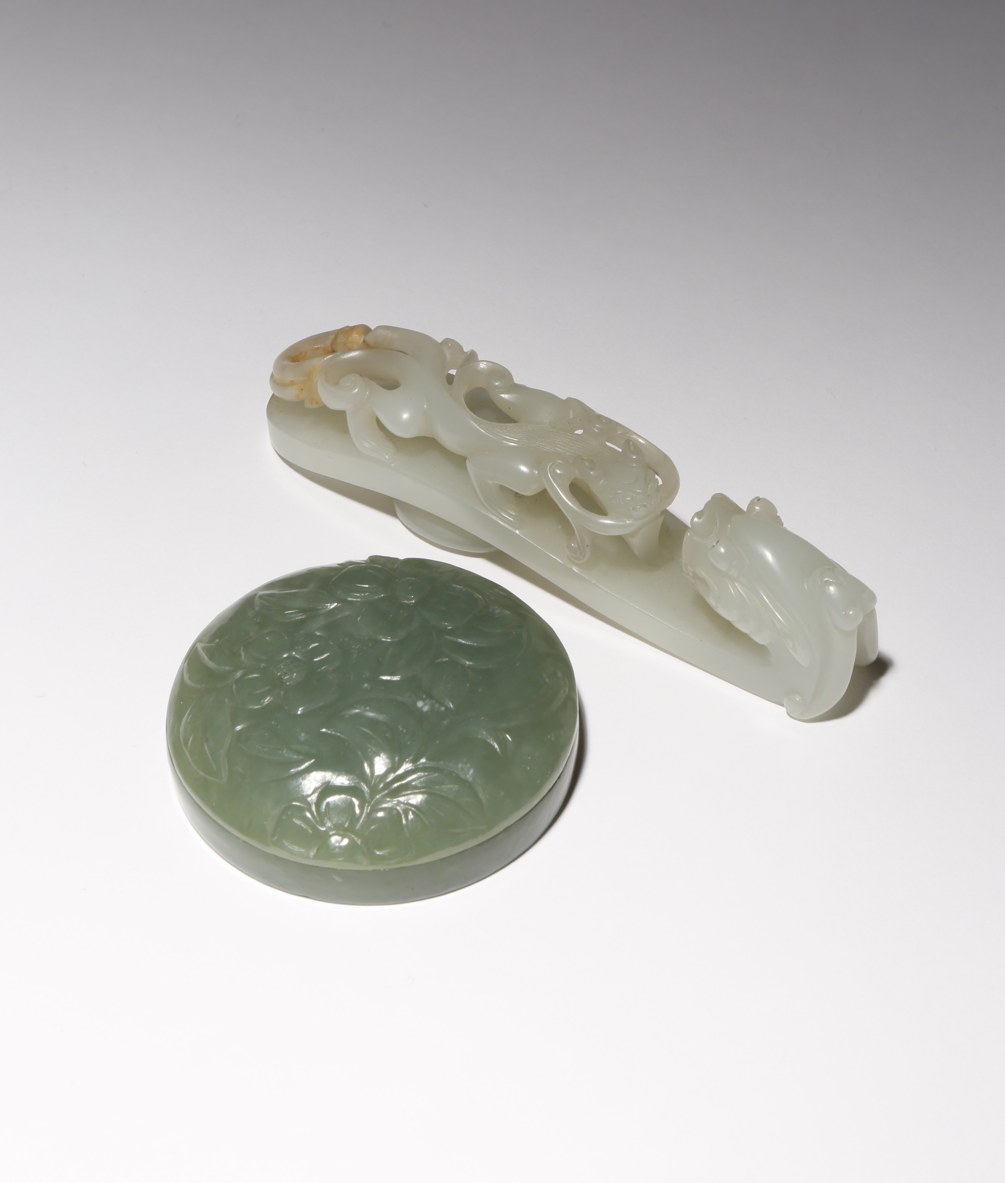The belthook terminating in the head of a fierce dragon, the shaft deeply carved with a sinuous chilong grasping lingzhi in its mouth, the stone of an even pale tone with some small russet inclusions, the seal paste box of circular form, carved in low relief to the cover with three flowers growing from leafy branches, the green stone with some inclusions, 10.3cm and 5.7cm. (3)