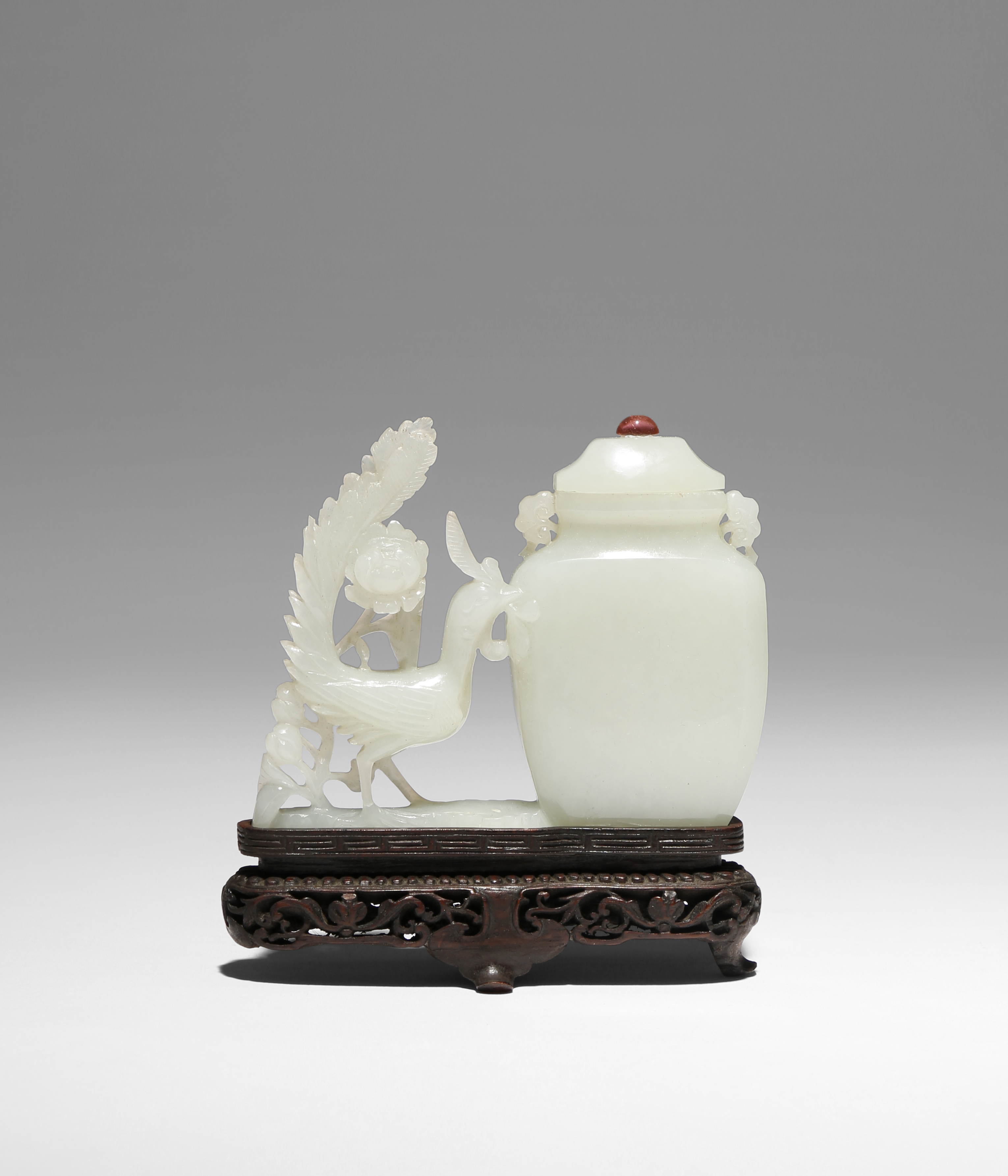 The flattened ovoid body rising to a waisted neck flanked by two handles shaped as lingzhi, carved to one side with a phoenix standing by a large peony bloom, the cover surmounted by a pink jewel, together with a reticulated wood stand, 9.2cm across. (3)