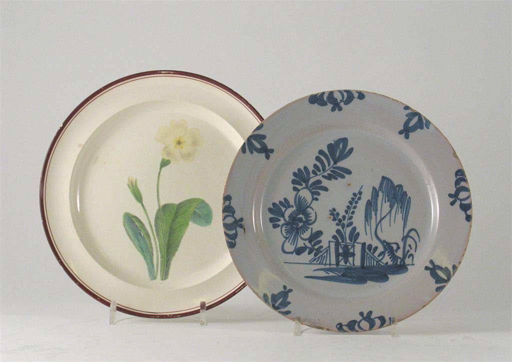 Two English pottery plates, one Delftware, painted in blue with Chinese flowers and trees, the other creamware finely painted with a primrose, 18th and early 19th century, 21cm. (2)