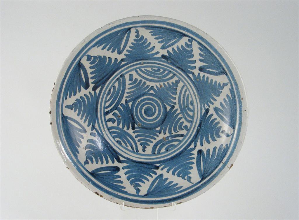 A Delft blue and white dish, painted with a geometric leaf pattern. A body crack. c.1700, 35cm.