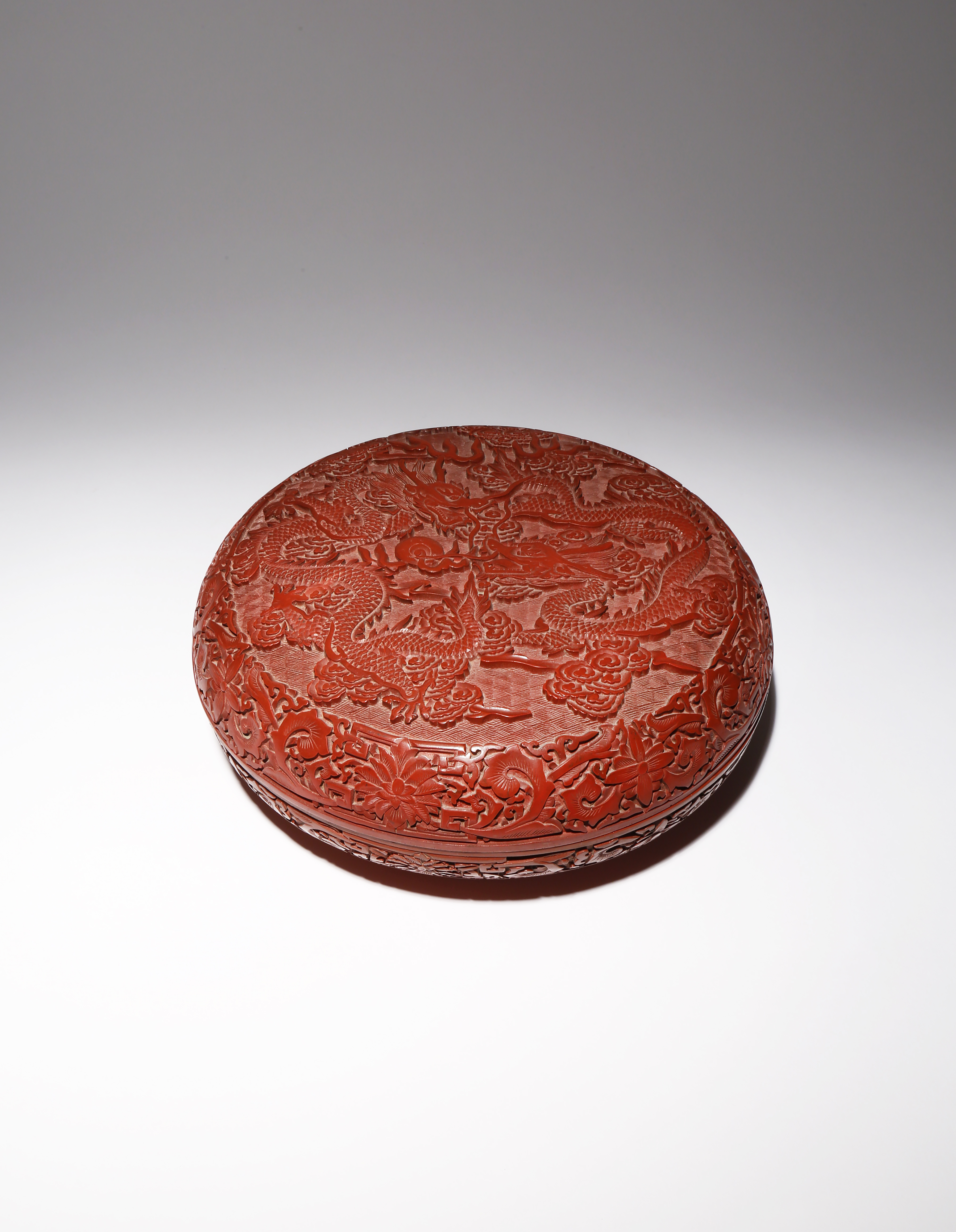 A LARGE CHINESE CINNABAR LACQUER CIRCULAR 'DRAGON' BOX AND COVER