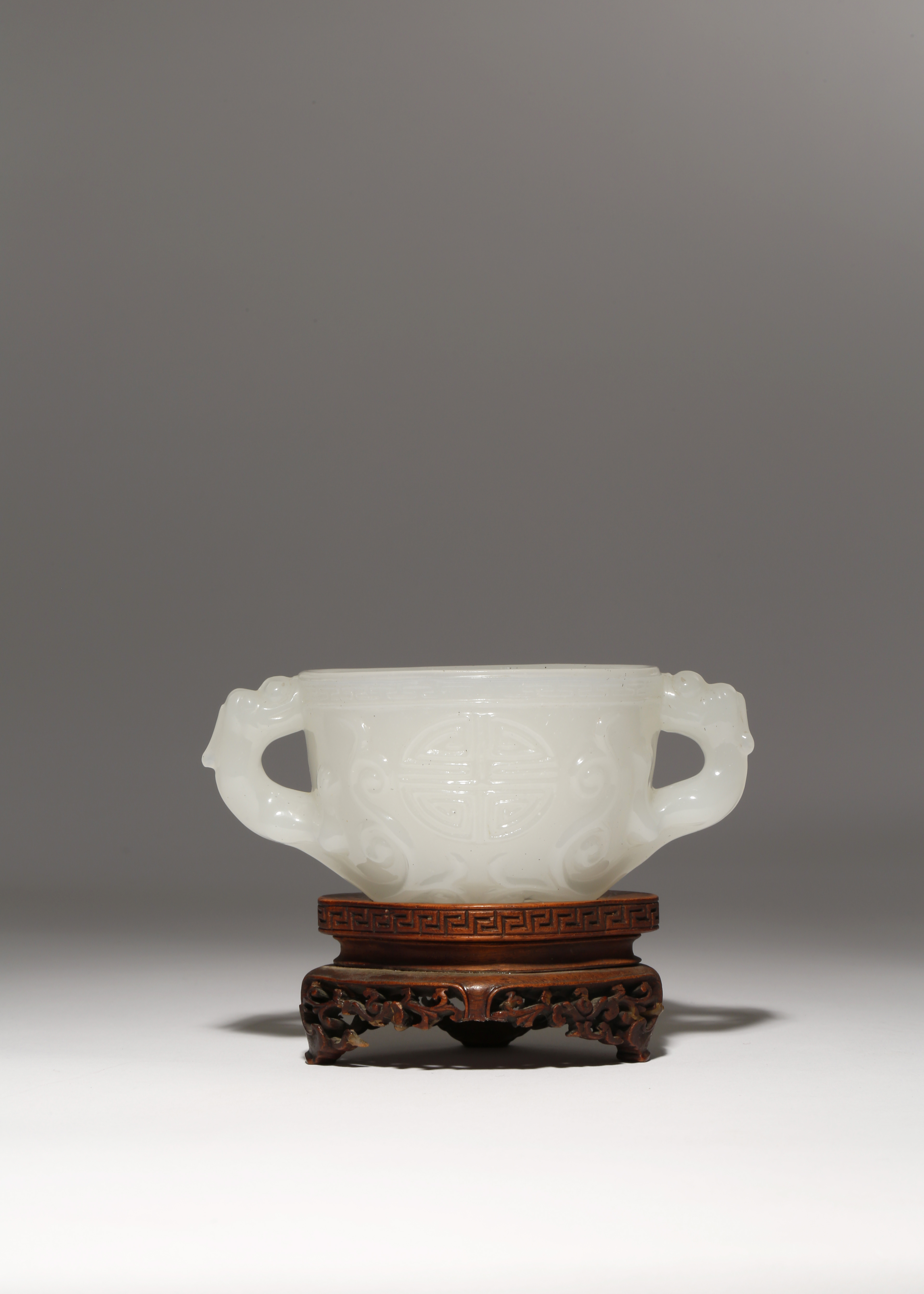 Cf. The Asian Art Museum of San Francisco, A Chorus of Colors: Chinese Glass from Three American Collections, p.43, no.17 for a comparable white glass twin-handled cup; see also Treasures of Chinese Glass Work Shops, p.21, no.6 for another related example.
