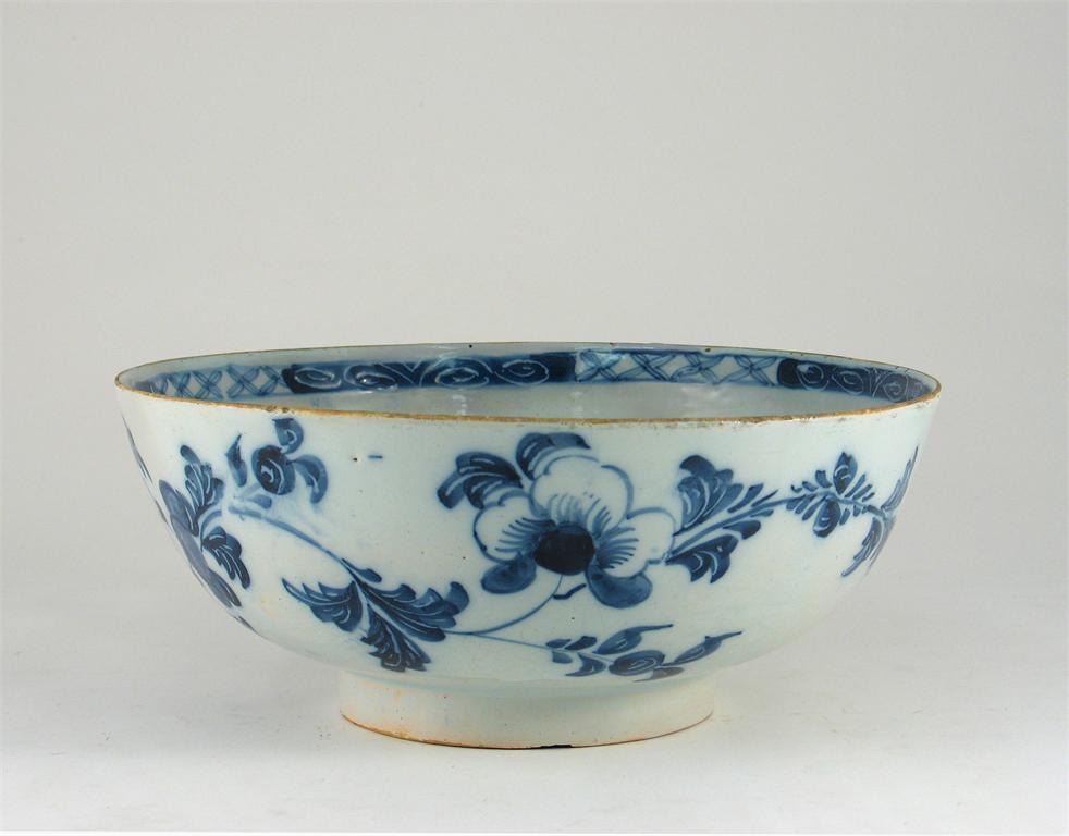 A Delft blue and white bowl, painted with flowers and foliage in the Chinese style. Some restoration. 18th century, 27cm.