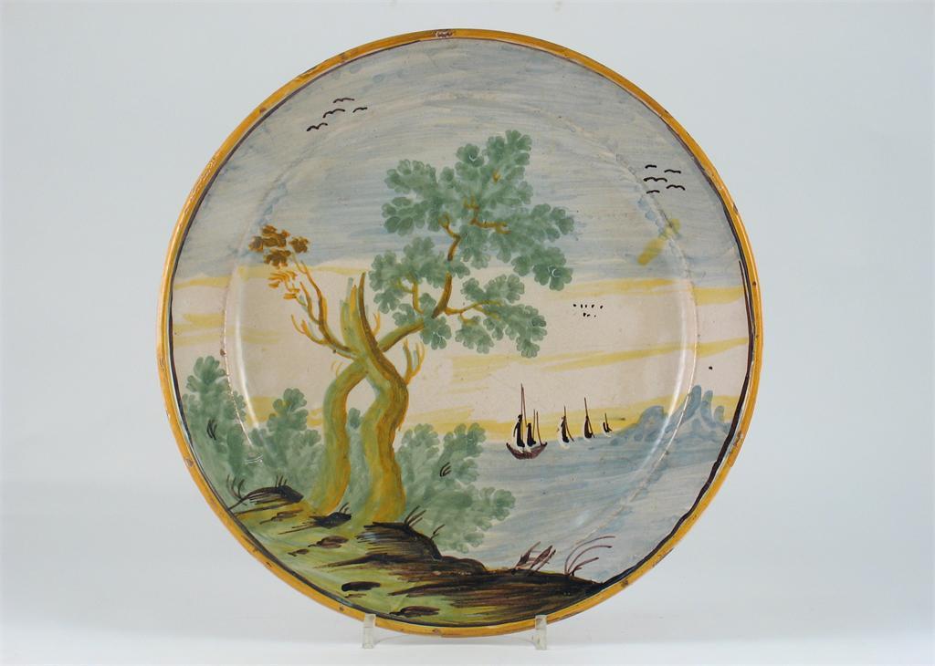 A Castelli maiolica plate, painted with four sailing ships in the distance beyond olive trees, 18th century, 27.5cm.