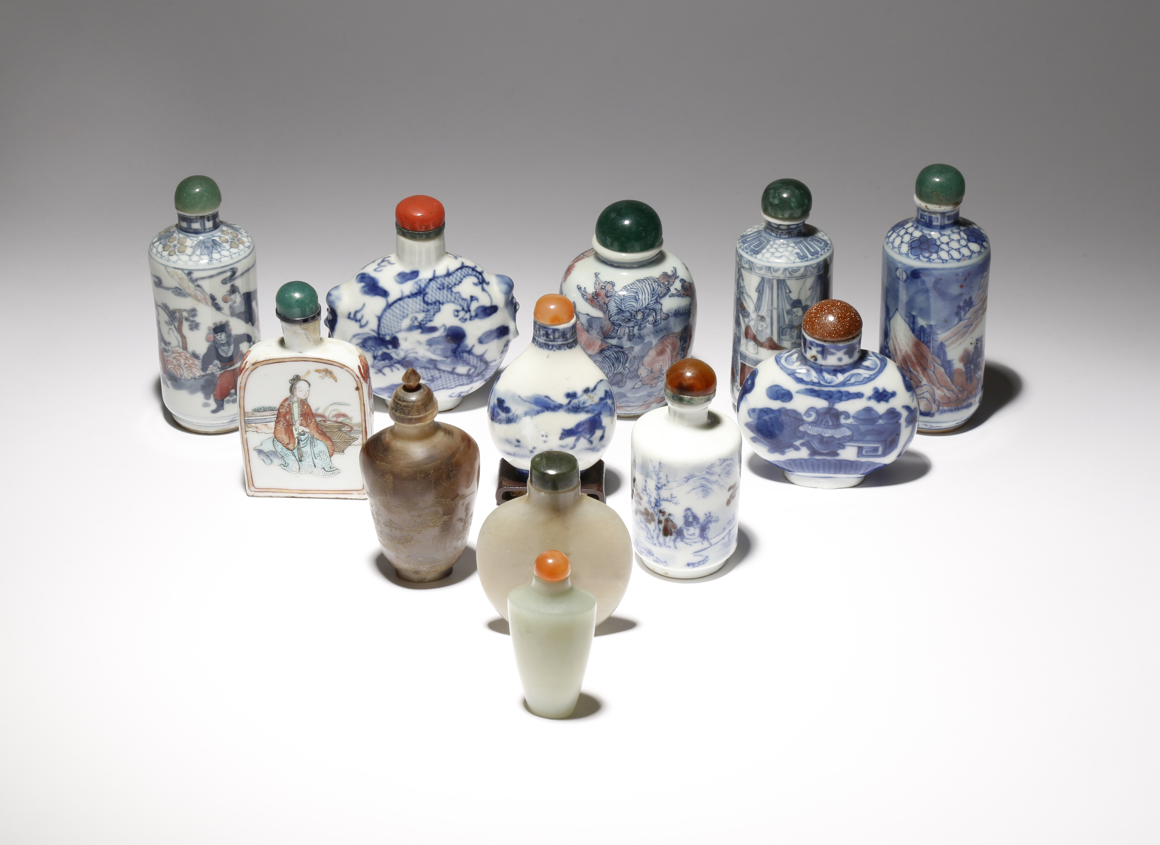 Comprising: one famille rose porcelain snuff bottle with a six character Tongzhi mark, one carved in horn, two in celadon jade, three blue and white porcelain snuff bottles, and five painted in underglaze blue and red, one with a six character Qianlong mark and another with four characters to the base, variously decorated with figures, animals, landscapes, precious objects and other designs, 8.7cm max. (12)
