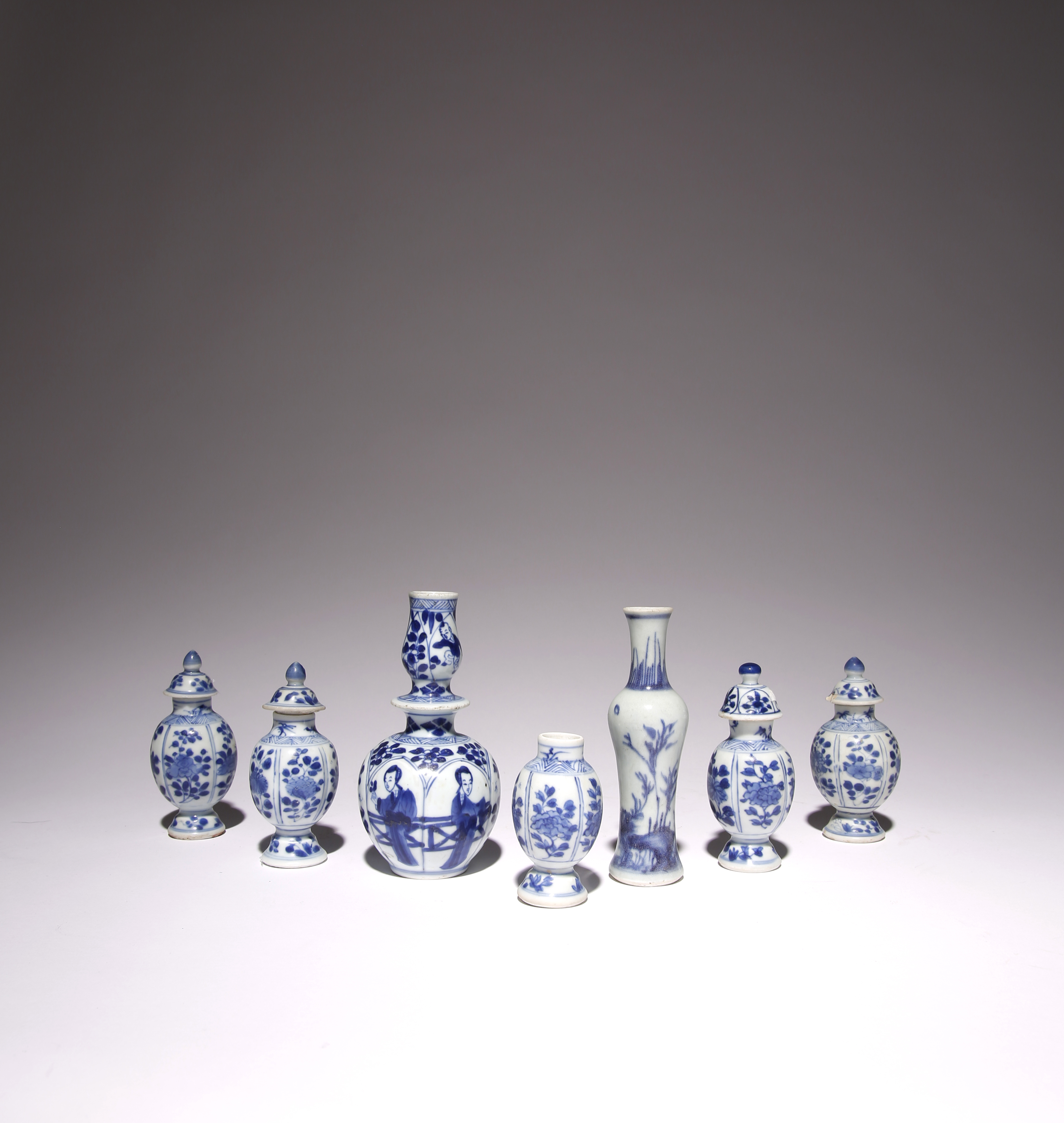 SEVEN MINIATURE CHINESE BLUE AND WHITE VASES