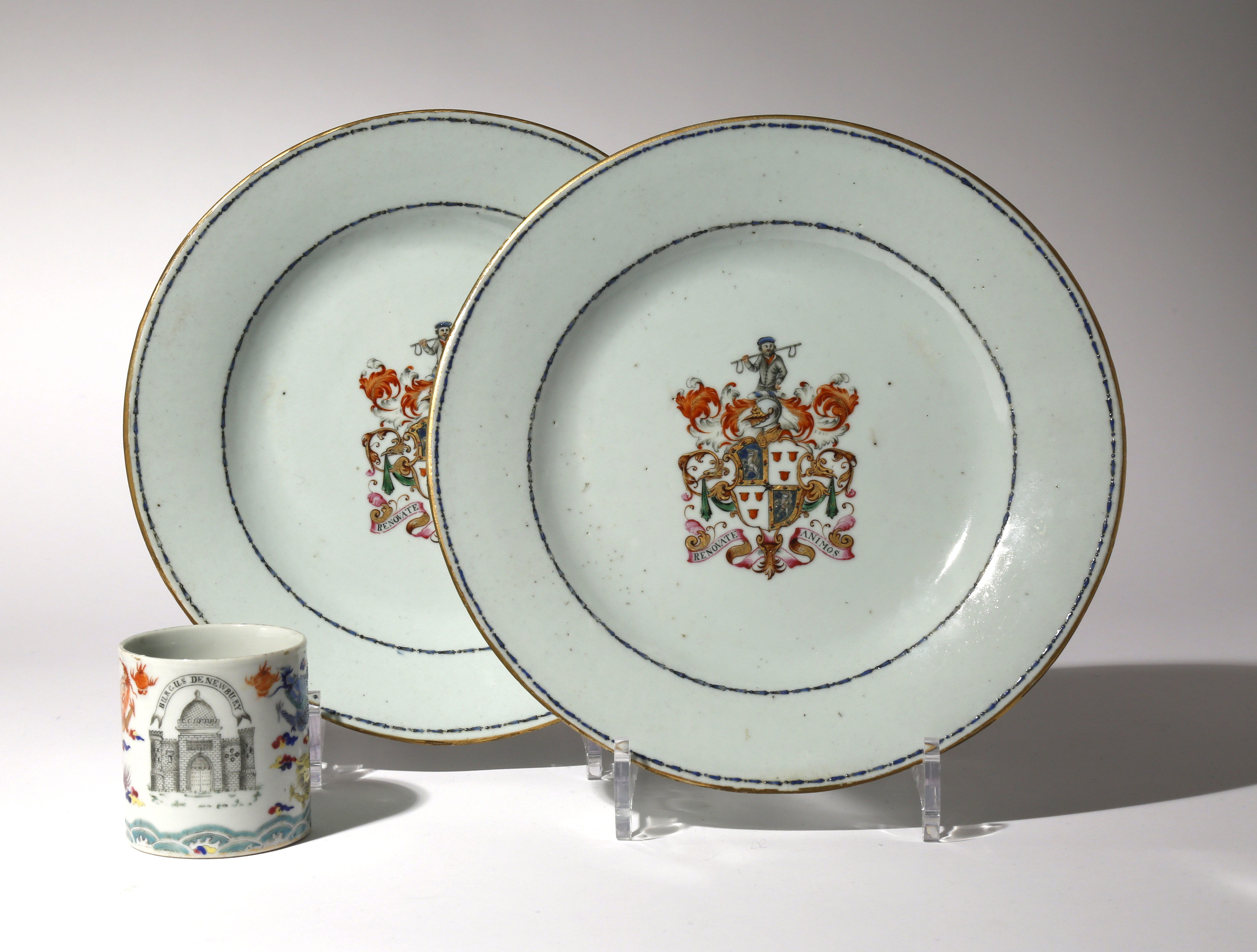 A PAIR OF CHINESE ARMORIAL PLATES AND AN ARMORIAL COFFEE CAN