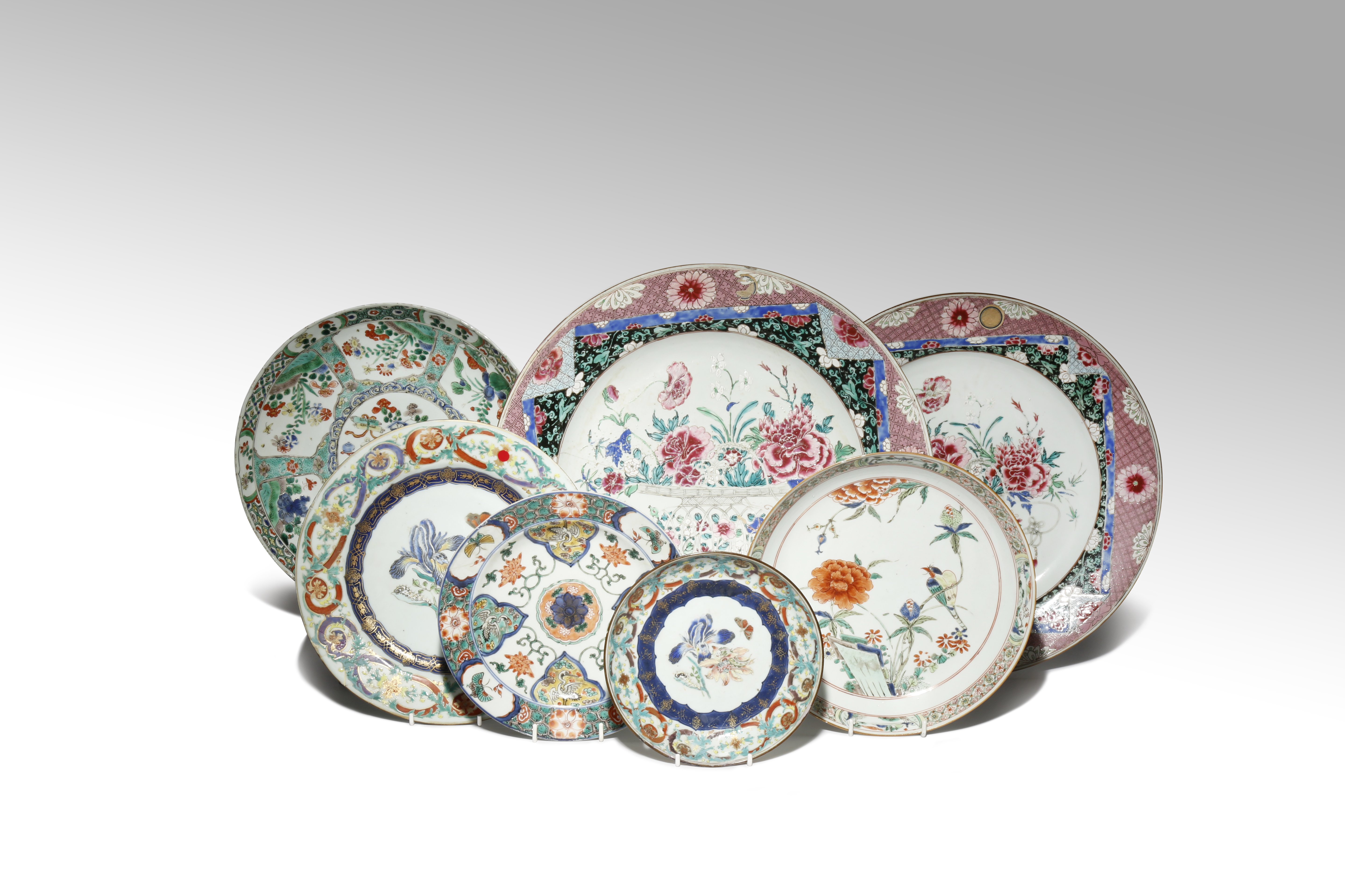 Comprising: two large famille rose plates painted with baskets of flowers surrounded by diaper, a famille verte dish decorated with a roundel enclosing precious objects surrounded by panels of various blossoms, a famille verte dish with a bird perched amidst peony, a small wucai plate painted with cartouches containing butterflies and cranes, and two enamelled and gilt-decorated dishes with designs after Maria Sybille Merian, six with paper labels for the Fonthill Heirlooms, 40cm. (7)