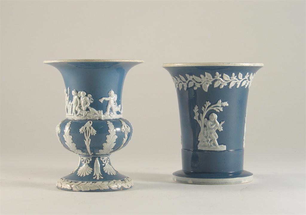 Two pearlware vases, both decorated in the Wedgwood style, with applied bas-reliefs of children, other figures and stylized leaves, unmarked, probably Wood and Caldwell. One with rim cracks. Early 19th century, 12cm. (2)