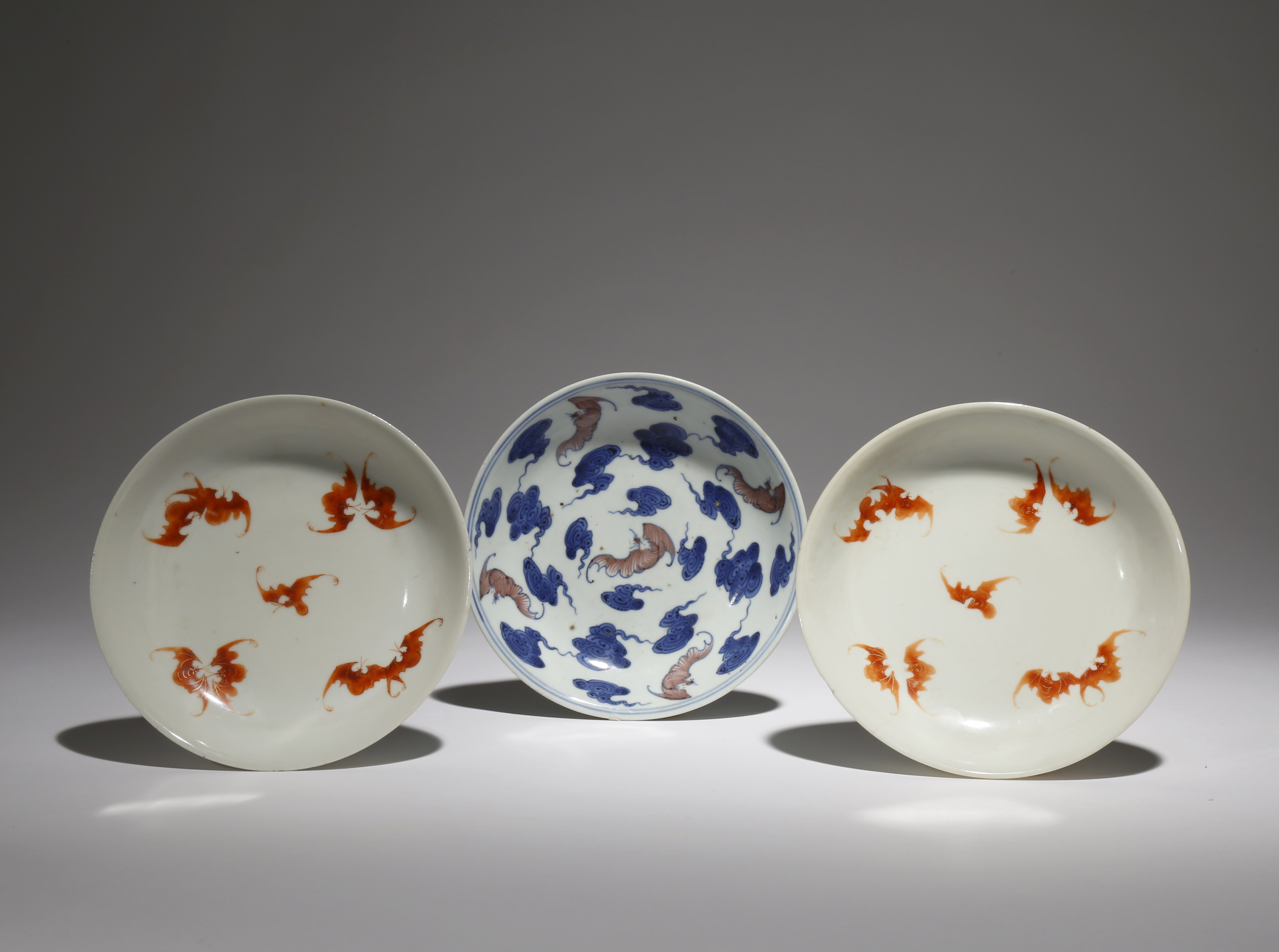 A PAIR OF CHINESE IRON-RED 'BATS' DISHES AND AND AN UNDERGLAZE BLUE AND RED 'WUFU' DISH