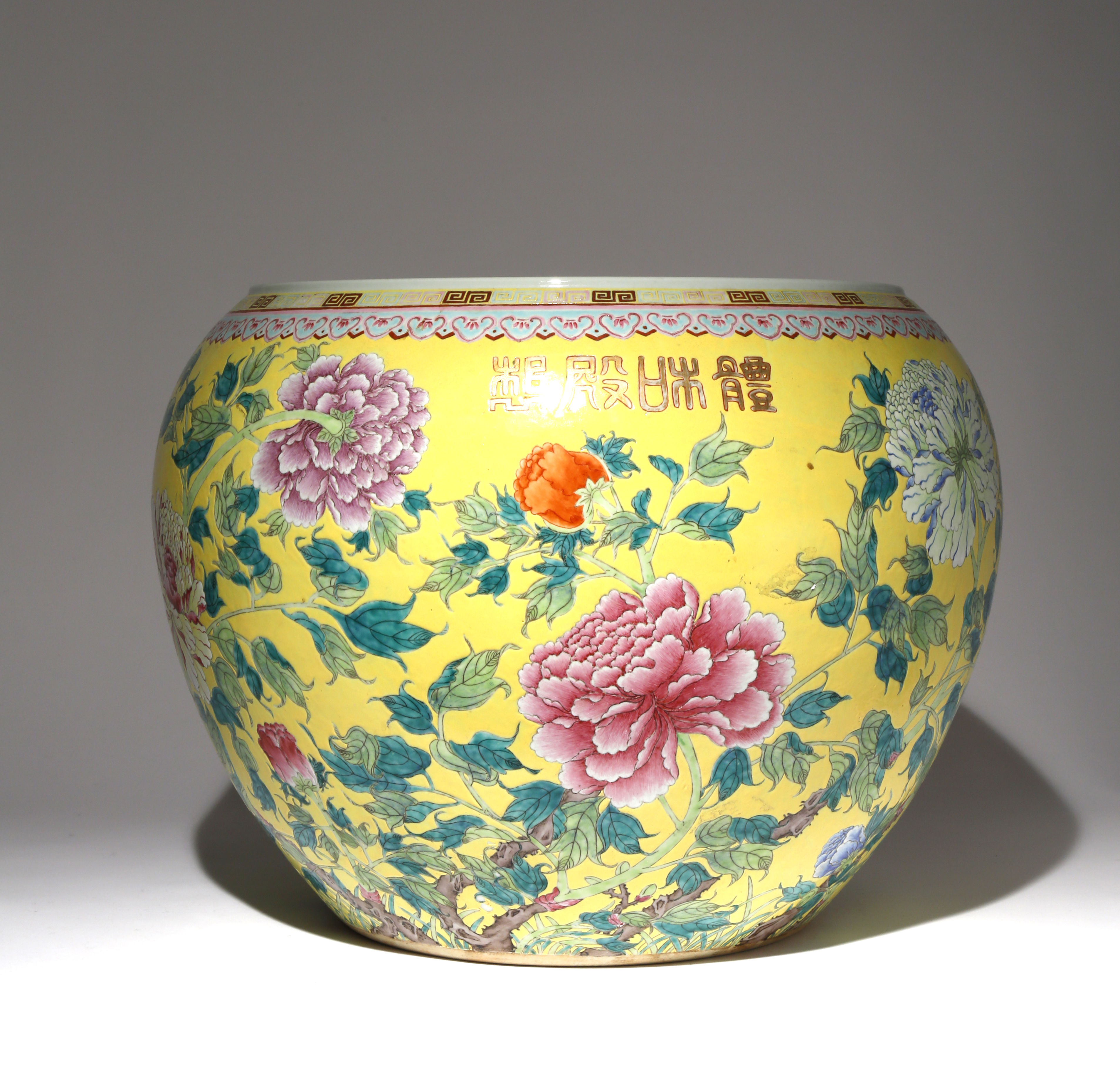 A MASSIVE CHINESE FAMILLE ROSE YELLOW-GROUND 'PEONY' JARDINIERE