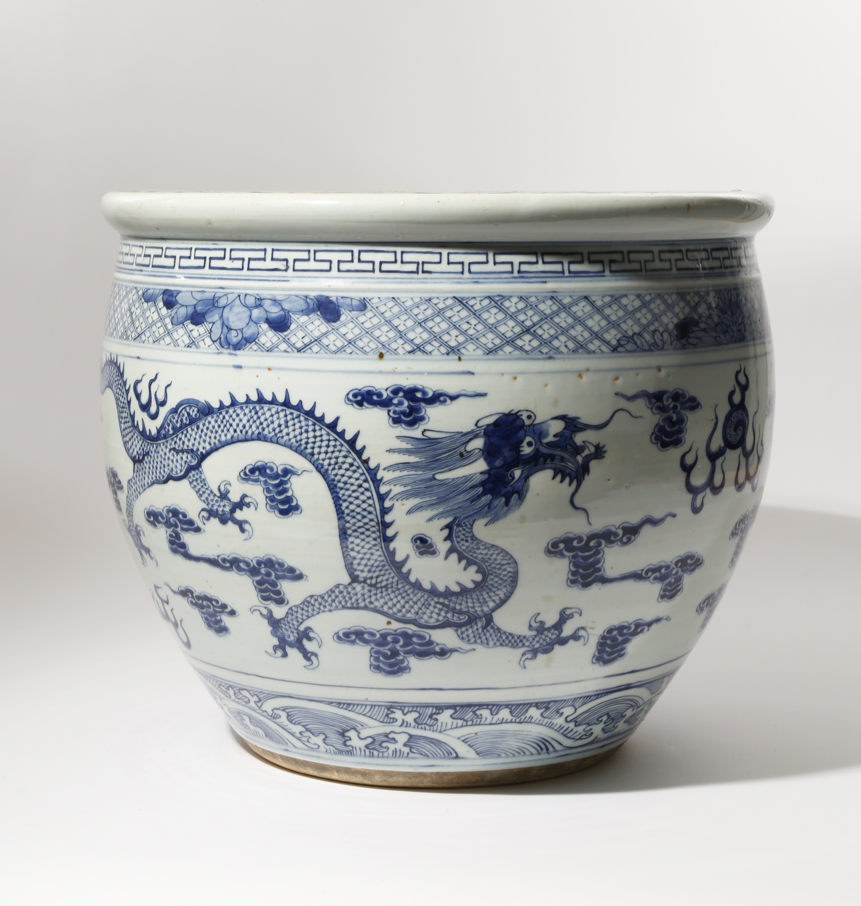 A LARGE CHINESE BLUE AND WHITE 'DRAGONS' JARDINIERE