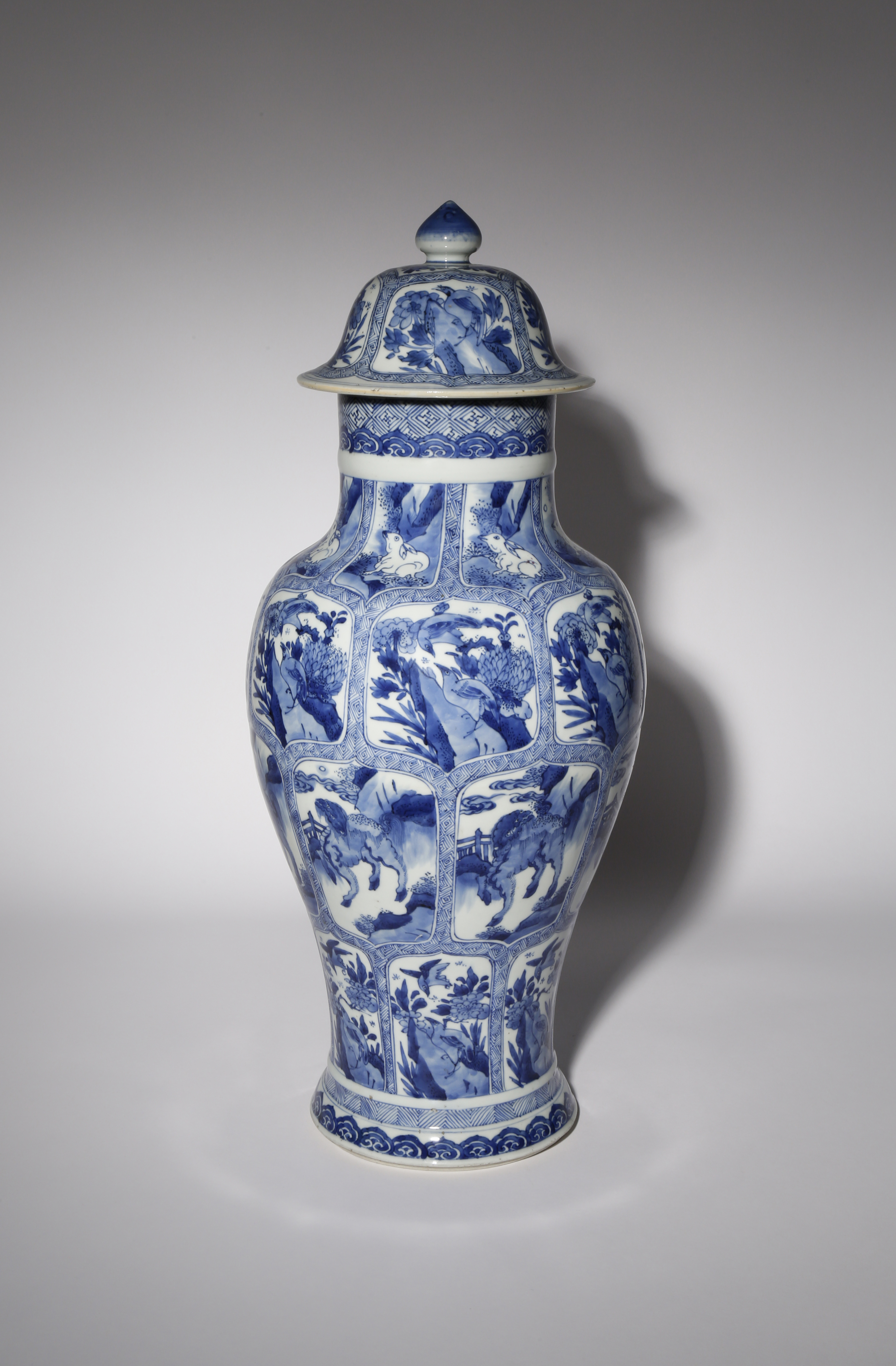 A CHINESE BLUE AND WHITE MOULDED BALUSTER VASE AND COVER