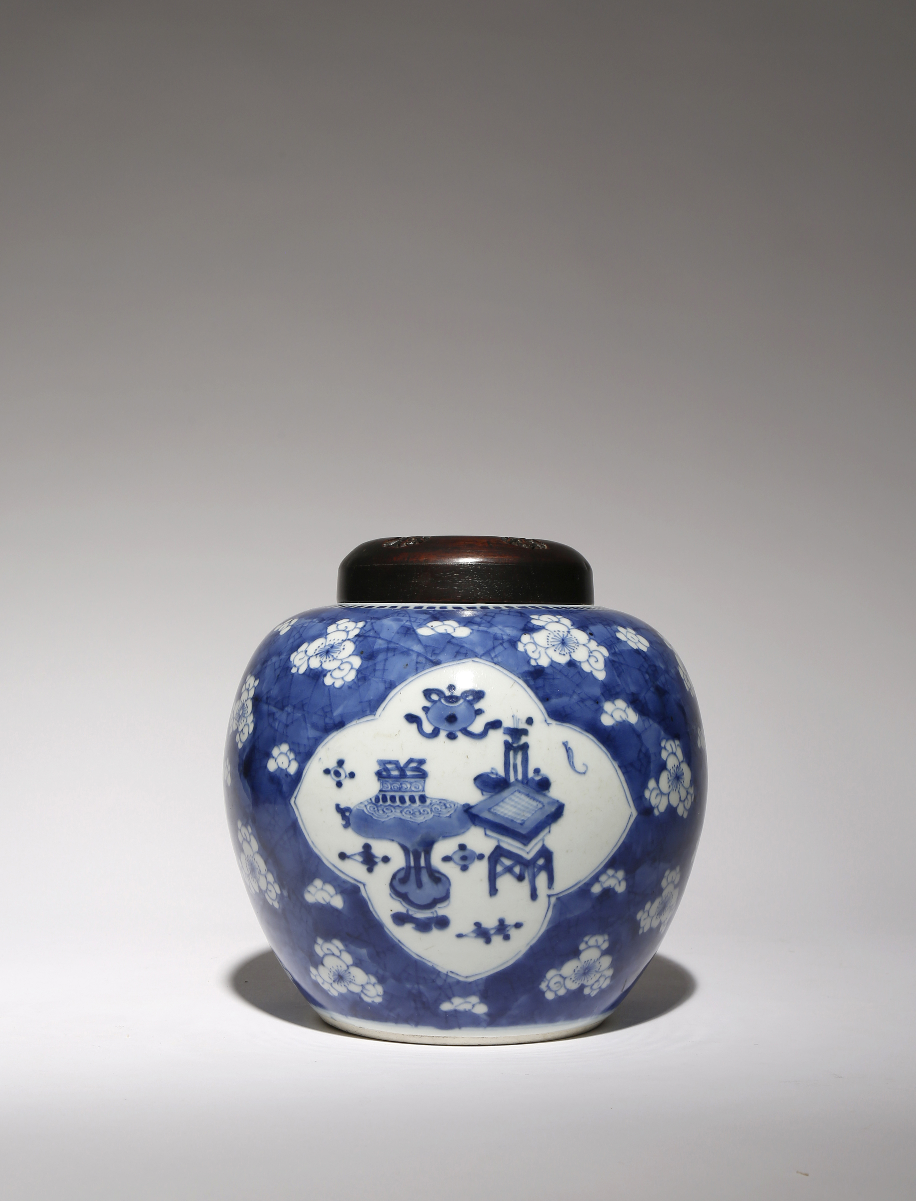 Painted with three quatrefoil cartouches containing archaistic vessels, peacock plumes, a qin and beribboned precious objects, all reserved on a prunus-decorated cracked-ice ground, with double rings to the base, together with a wood stand pierced with shou characters, 19.8cm. (2)