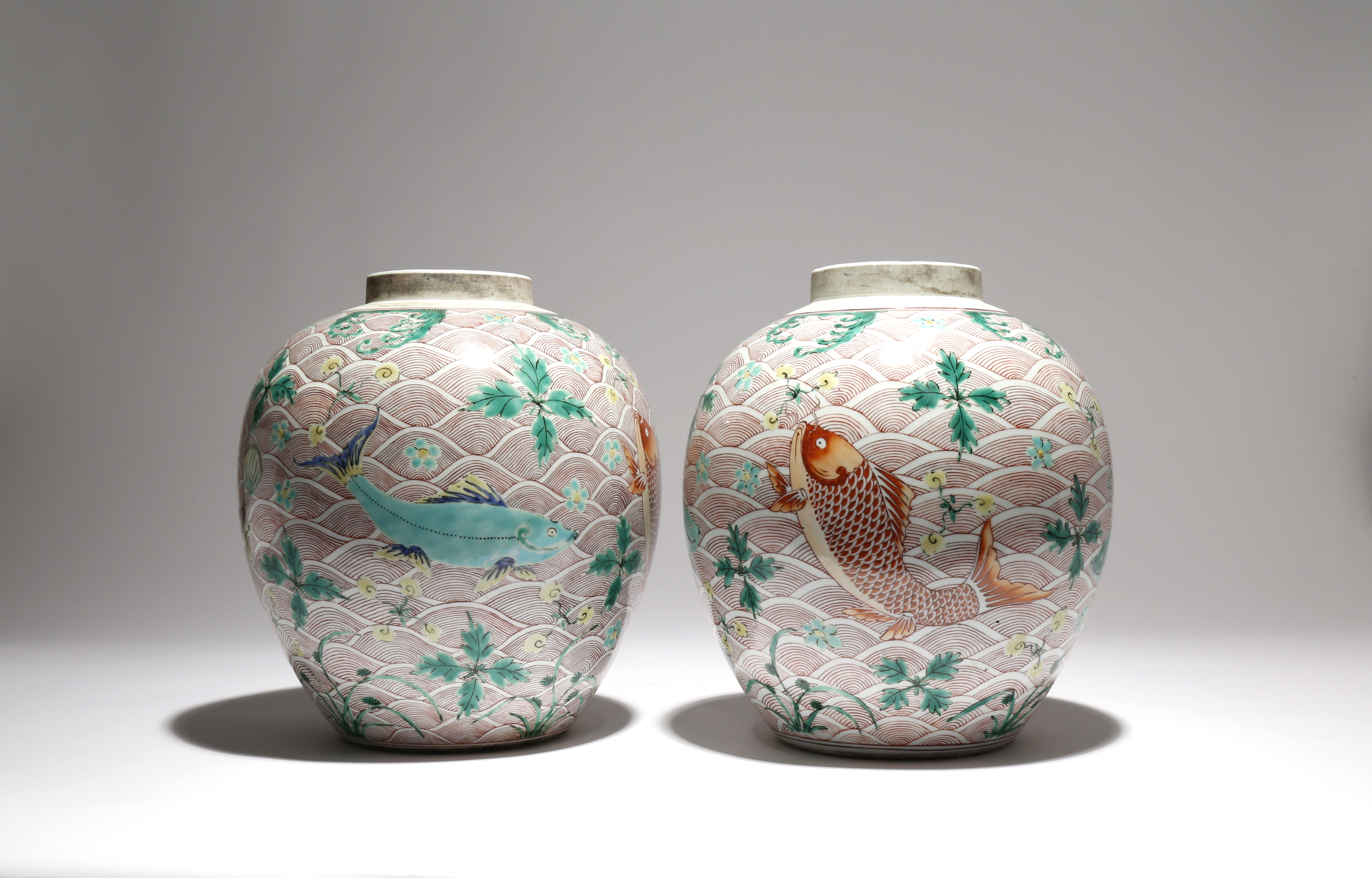 Each painted in enamels with four large fish leaping amidst leafy sprays and dainty blossoms, the designs reserved on a finely painted red ground of rolling waves, each surmounted by a short straight neck, 26.5cm. (2)