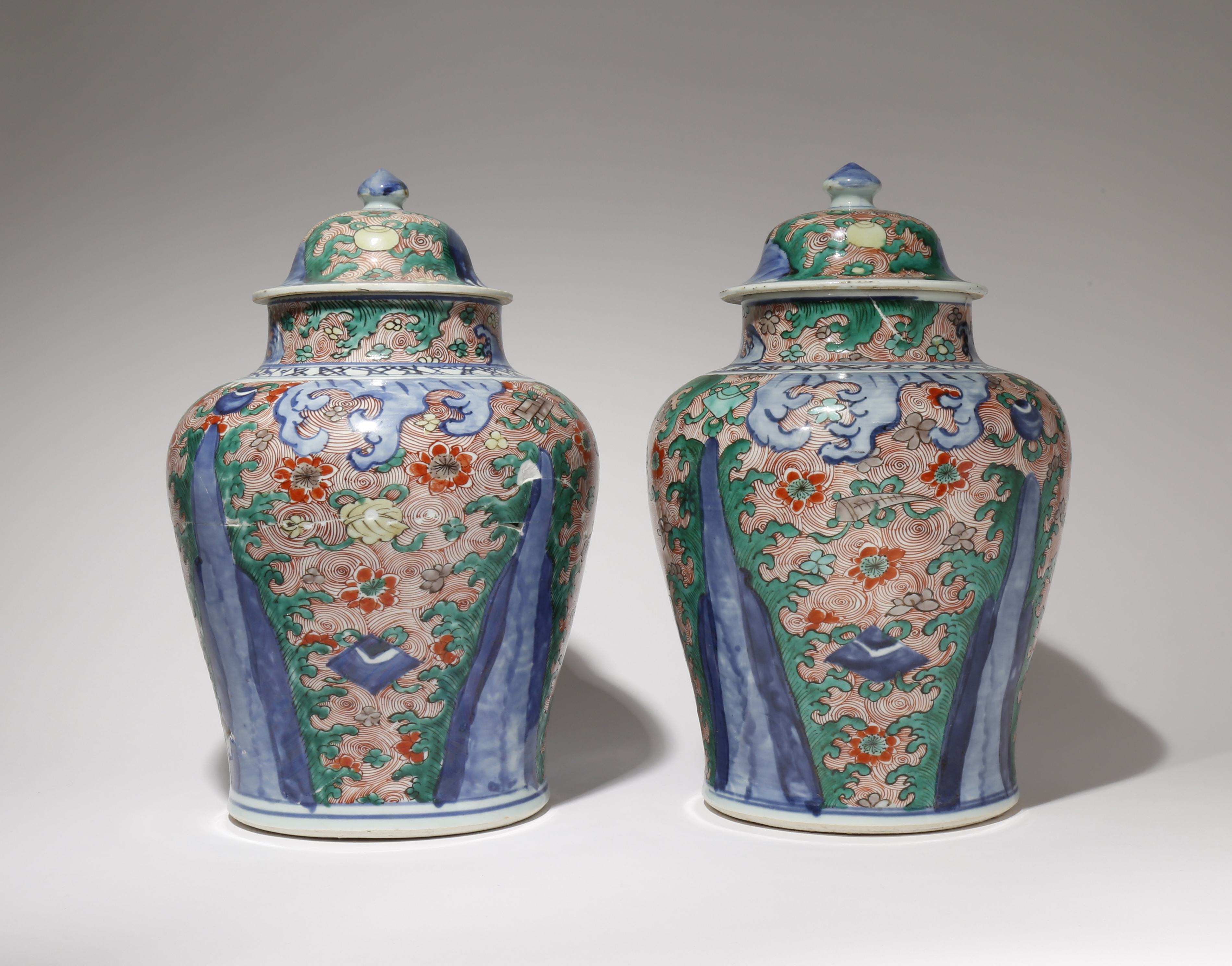 Painted with beribboned precious objects and flowers amongst tall rocks and crashing waves, the covers similarly decorated, all reserved on a ground of iron-red swirls, with stylised geometric bands in underglaze blue to the shoulders, each with a green and black seal mark reading fu to the base, 40.5cm. (4)