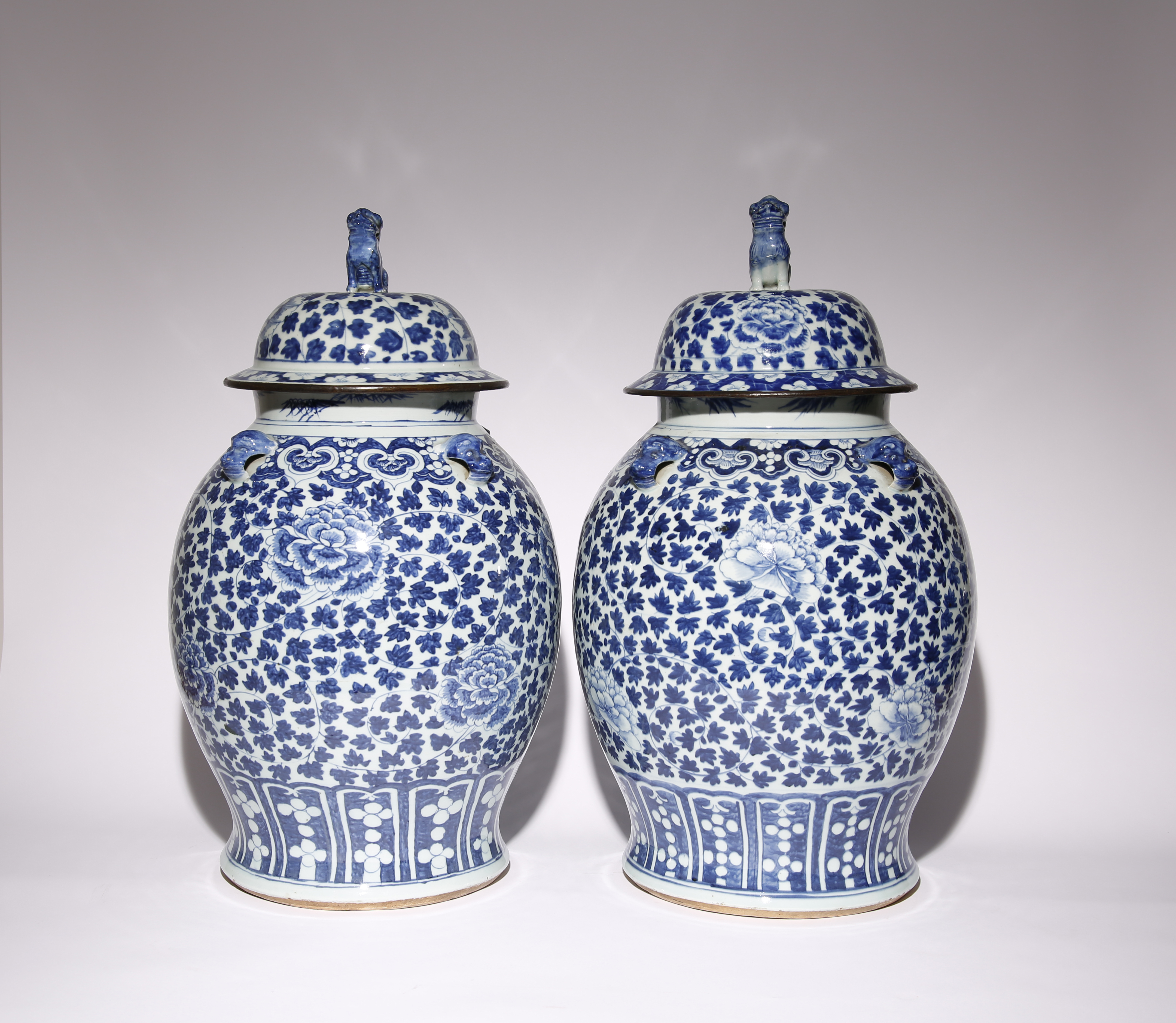Each painted with large peony blooms set amidst scrolling leafy branches, the design contained between bands of ruyi-heads and lappets, each with four applied animal masks to the shoulder, the short necks decorated with sprays of bamboo, the covers surmounted by finials formed as seated lion dogs, 64cm and 63.5cm. (4)