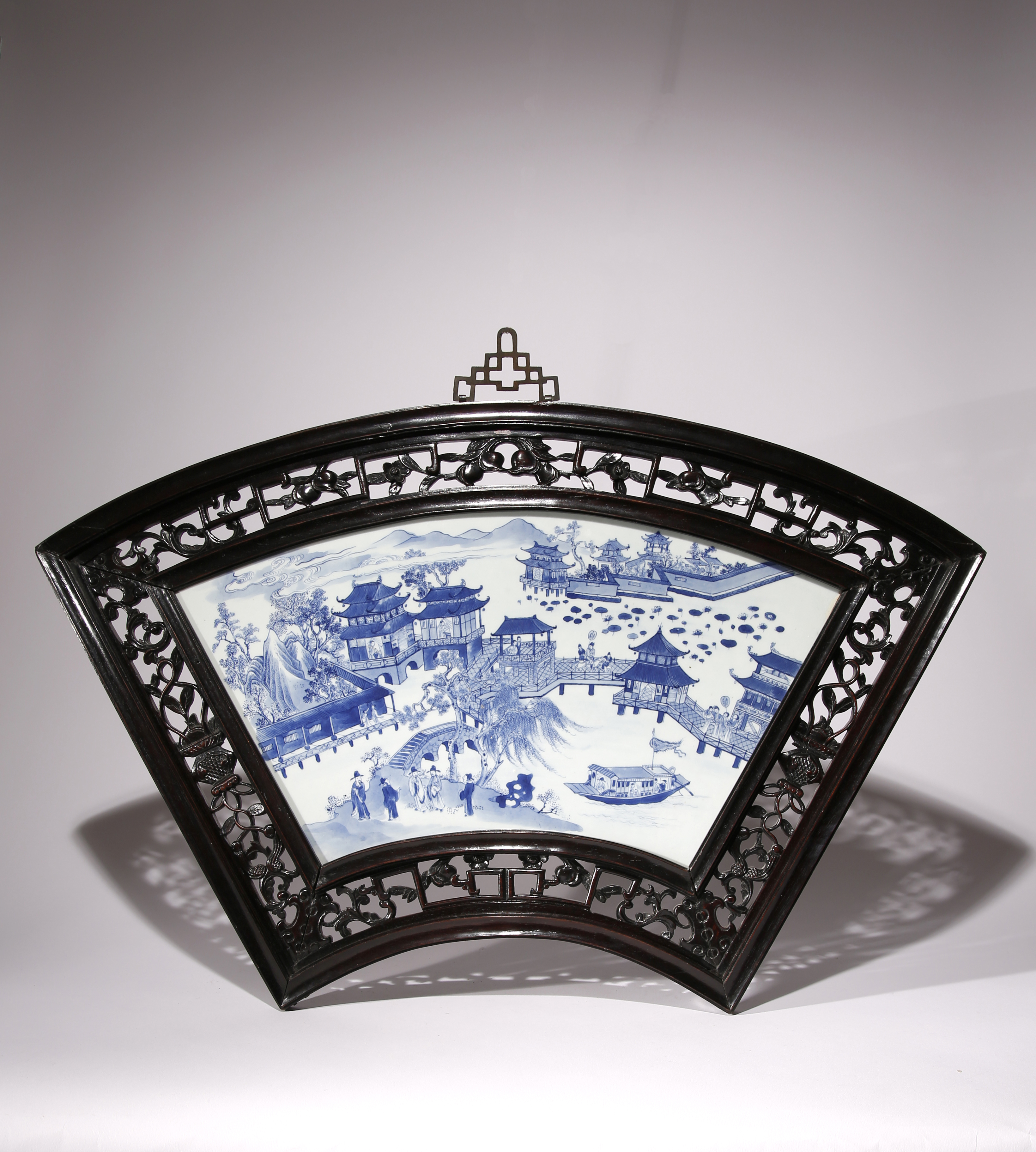 A CHINESE BLUE AND WHITE FAN-SHAPED 'LANDSCAPE' PLAQUE