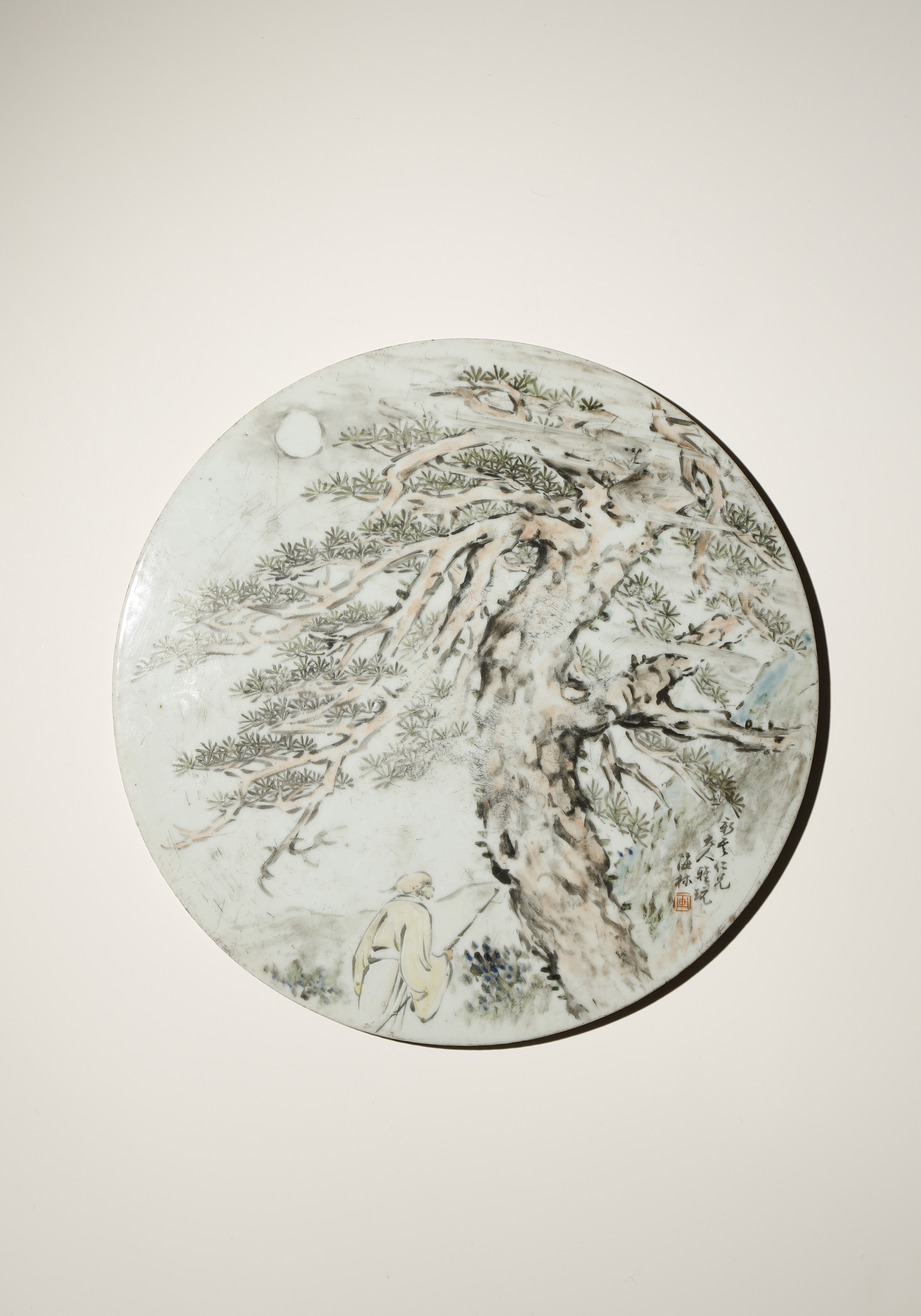 Painted with a figure carrying a staff, he stands beneath a gnarled pine tree gazing up at the moon, with calligraphy to one side, 29.2cm dia.