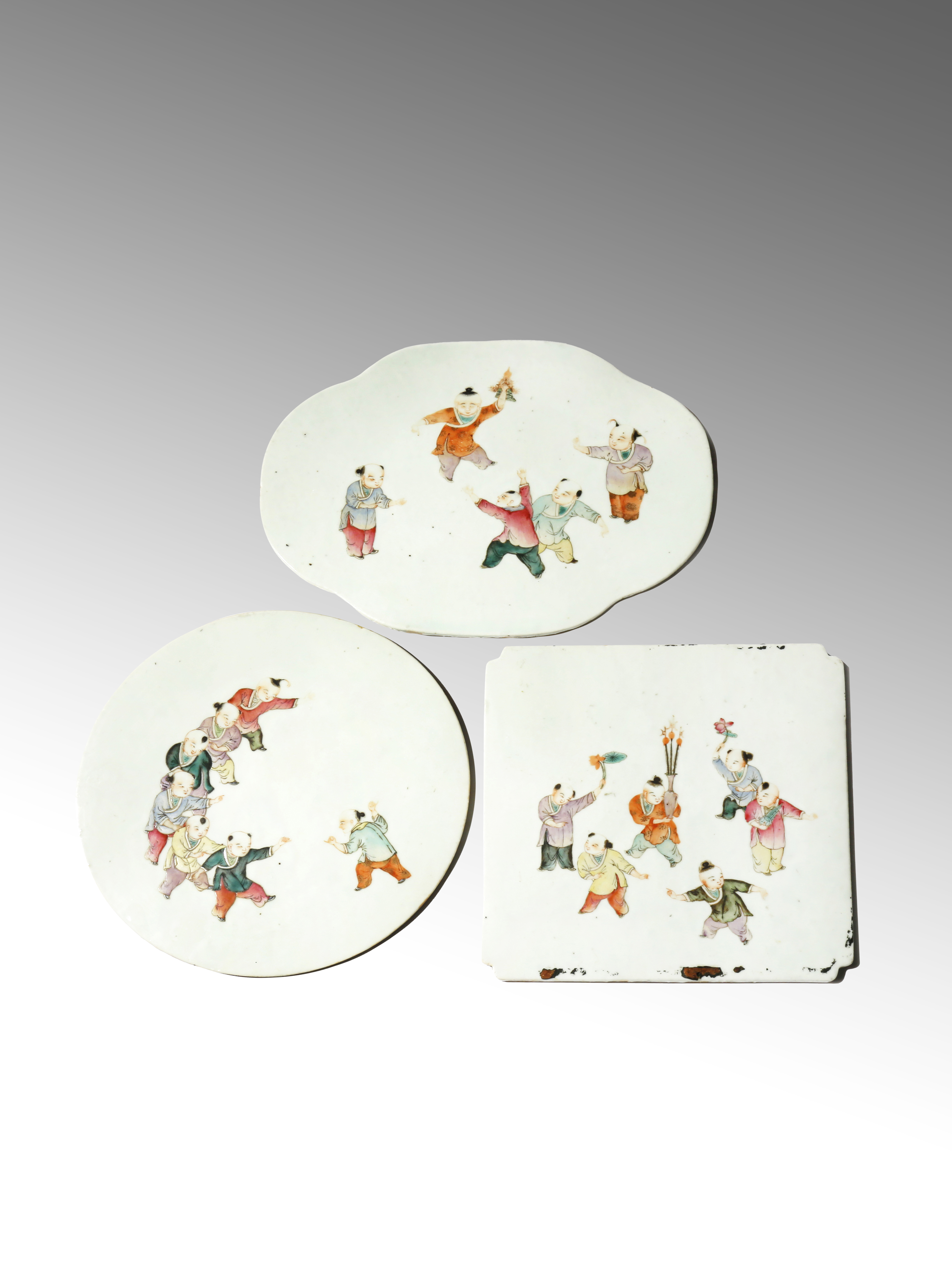 One of quatrefoil form, another square with chamfered corners, the third circular, each decorated with small boys at play, with areas of detail highlighted in gilt, 28.3cm max. (3)