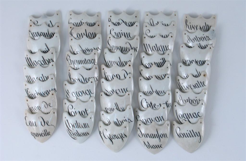 Forty two Continental porcelain shield-shaped bottle tickets, variously inscribed, 4cm. (42)