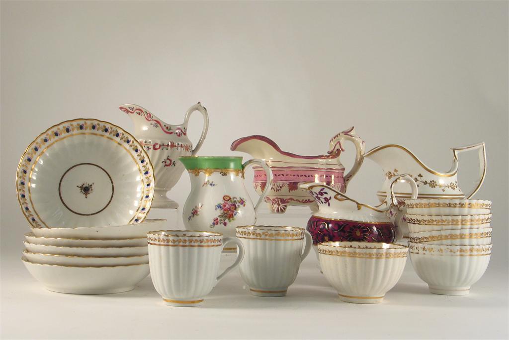 Five English porcelain milk jugs, variously decorated with flowers and foliage, together with five Worcester trios of fluted form and a similar saucer. Minor faults. All 19th century. (21)
