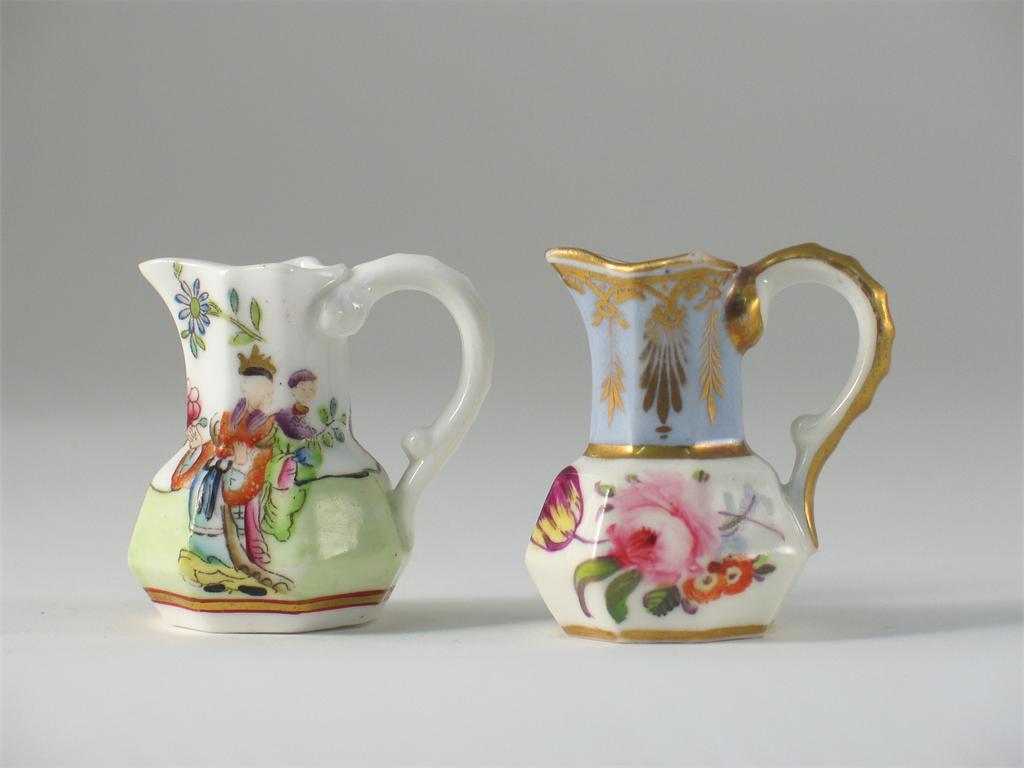 Two miniature porcelain jugs, one painted with flowers beneath a lavender neck, the other decorated with Chinese figures, pattern no.3644, c.1820-30, 4.5cm. (2)