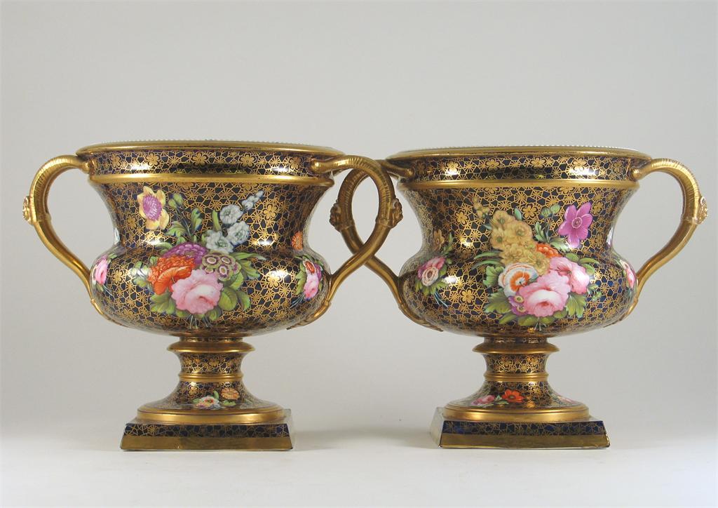 A large pair of Spode campana vases, with bifurcated handles, decorated with colourful flowers on a blue ground with gilt prunus and cracked ice, marked 'Spode 3908', c.1820, 29.5cm. Wide. (2)