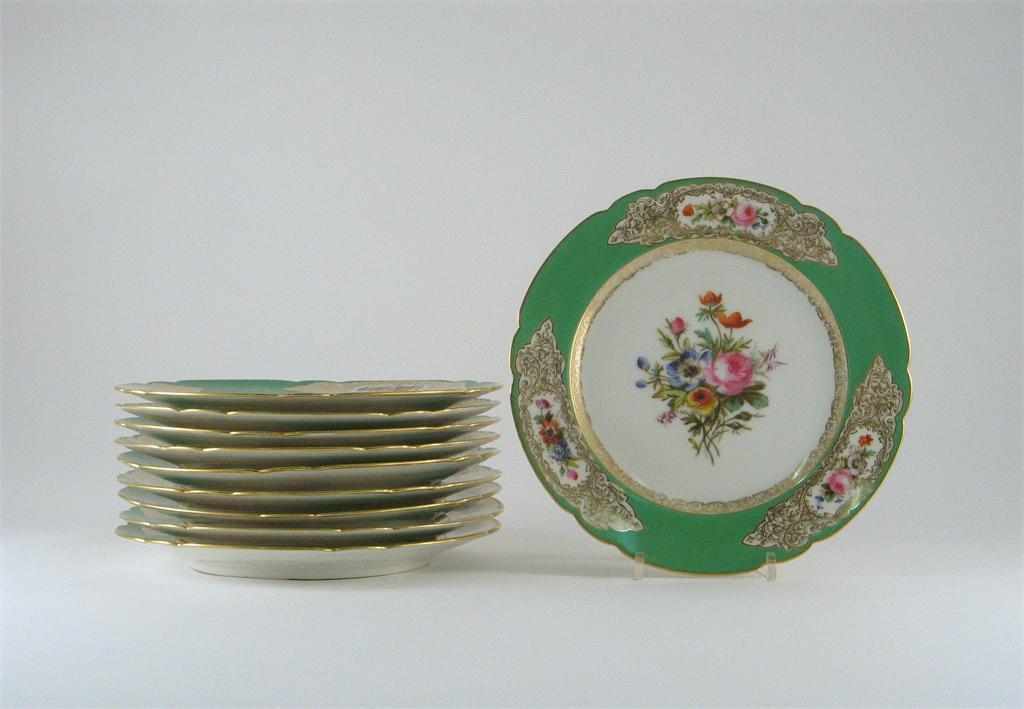 A set of ten Paris porcelain plates, painted with flowers within green borders, 19th century, 23.5cm. (10)