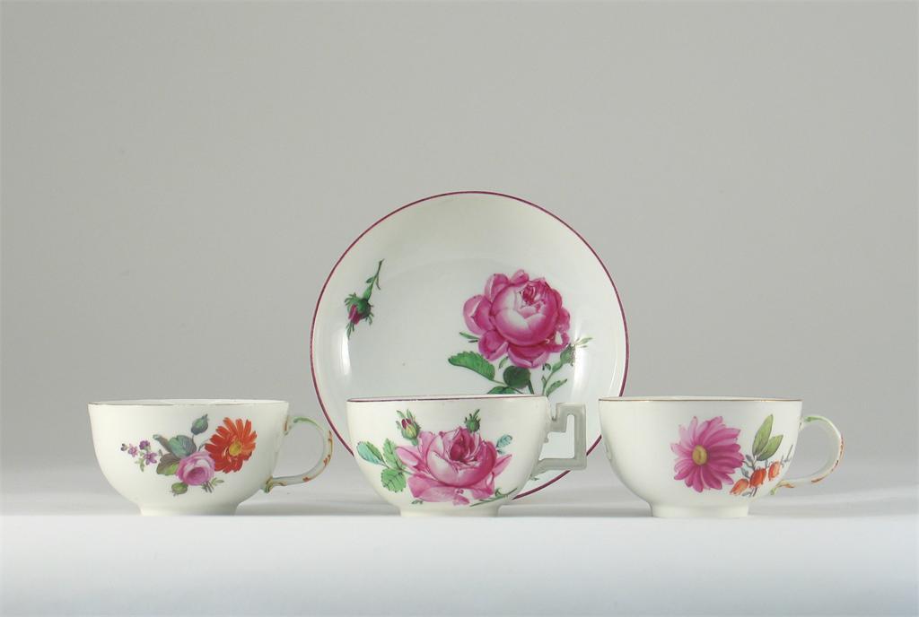 A Meissen cup and saucer, painted with pink roses and a pair of Berlin cups also painted with colourful flowers, crossed swords and sceptre marks, 18th century. (4)