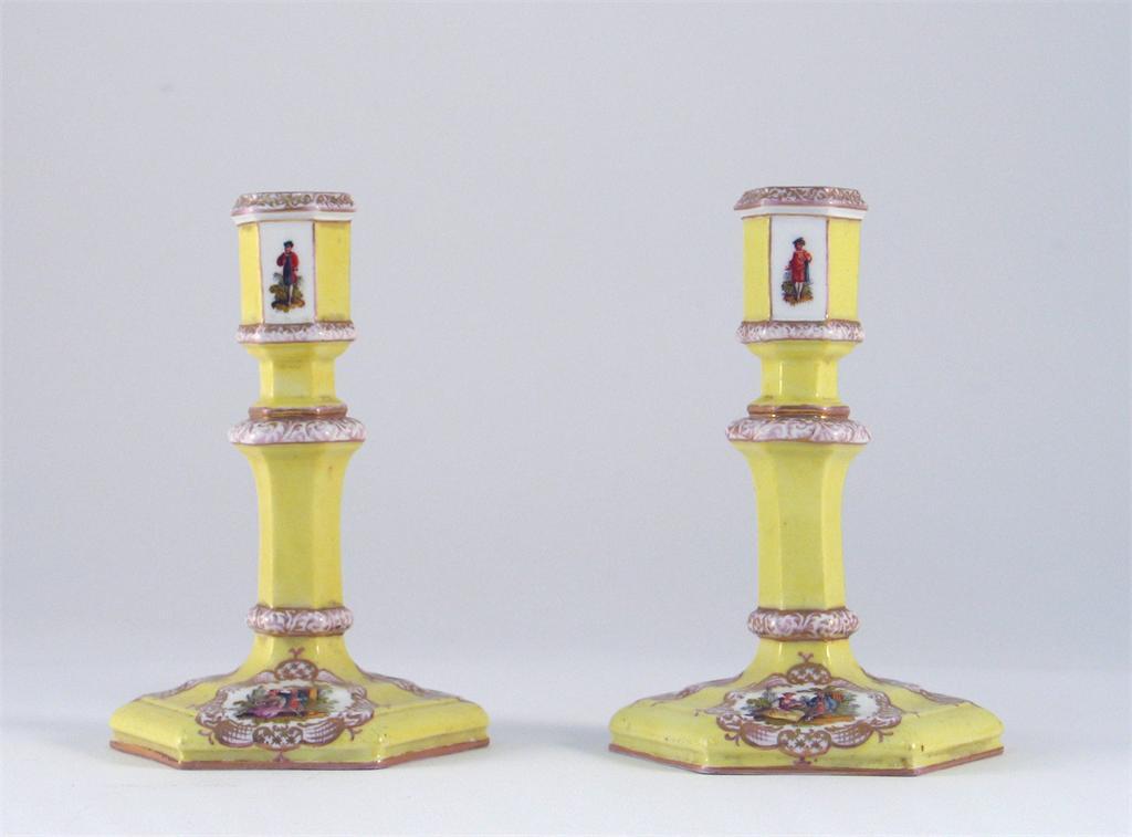 A pair of Berlin hexagonal-section candlesticks, painted with panels of figures on a canary yellow ground, sceptre marks. Some wear. Late 19th century, 13.5cm. (2)